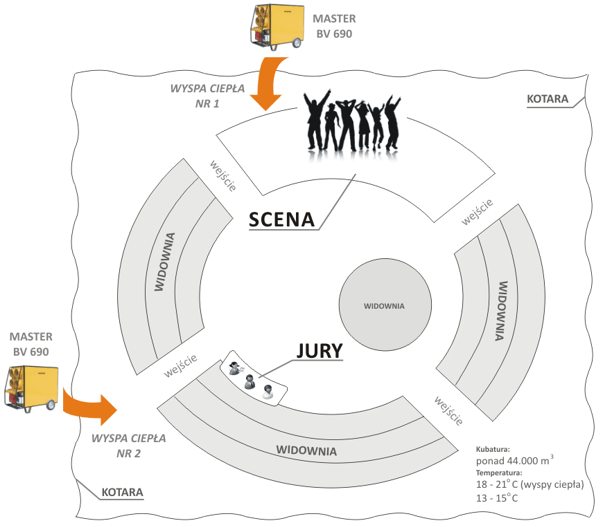Strefy, zwane wyspami ciepła znajdujące się w bezpośredniej bliskości zakończeń przewodów rozprowadzających ciepłe powietrze, zostały usytuowane w pobliżu występów uczestników oraz miejsca zasiadania jurorów.