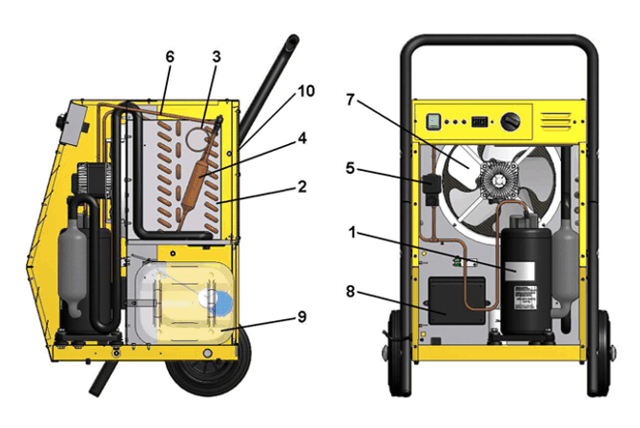 Najważniejszą częścią kondensacyjnego osuszacza powietrza, jest sprężarkowy układ chłodniczy. To dzięki niemu możliwe jest uzyskanie kondensacji pary wodnej, a tym samym obniżenie zawartości wody w powietrzu.