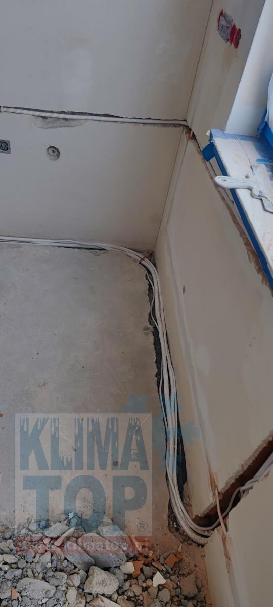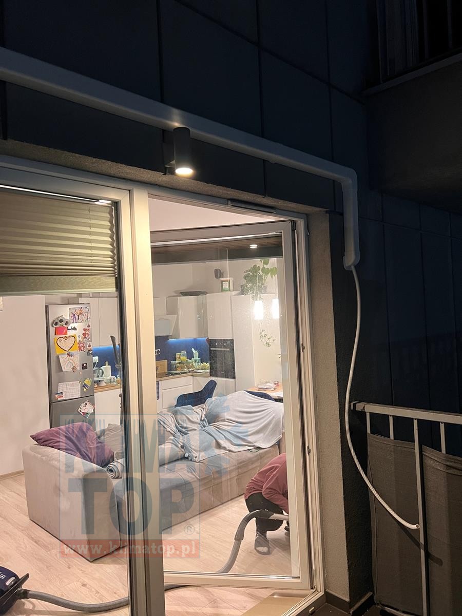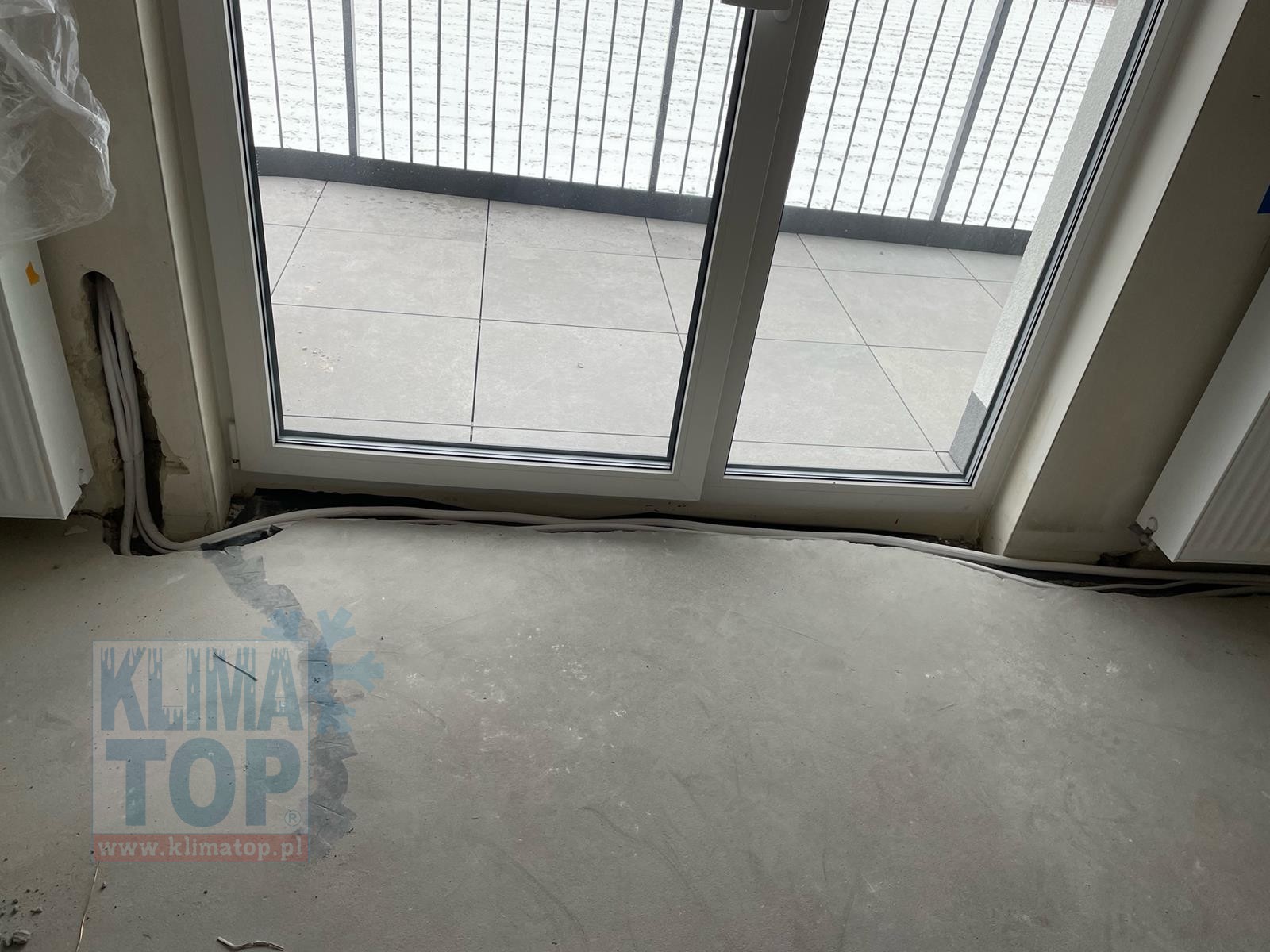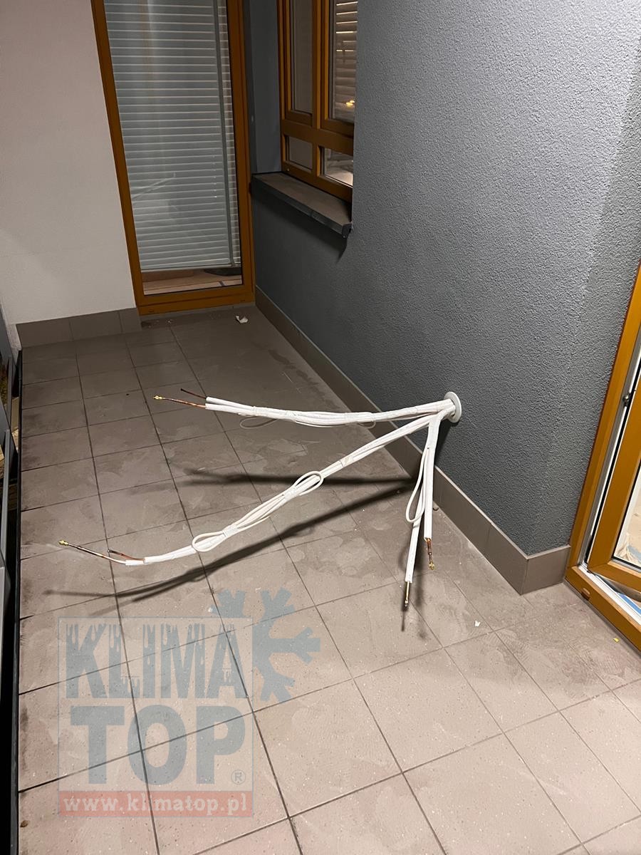 prostopadłej do okien. Instalacja (zarówno chłodnicza, jak i skroplinowa) została poprowadzona w bruździe w ścianie pod okno, gdzie została wyprowadzona na balkon. Tam instalacja chłodnicza została doprowadzona do prawego boku agregatu zewnętrznego i podłączona do niego, a skroplinowa doprowadzona do miejsca, gdzie woda będzie zbierana do zbiornika.