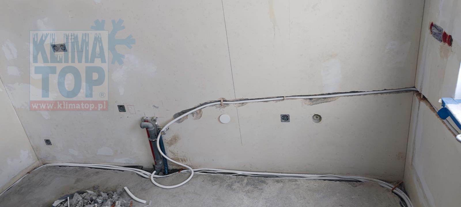 Jednostka wewnętrzna została zainstalowana na prostopadłej do okien. Instalacja chłodnicza została sprowadzona w bruździe w ścianie na wysokość około 50 cm nad posadzką, a następnie przeprowadzona na balkon i podłączenia do agregatu zewnętrznego posadowionego na posadzce. Skropliny zostały odprowadzone oddzielną bruzdą w miejsce przyszłego zlewozmywaka w kuchni.