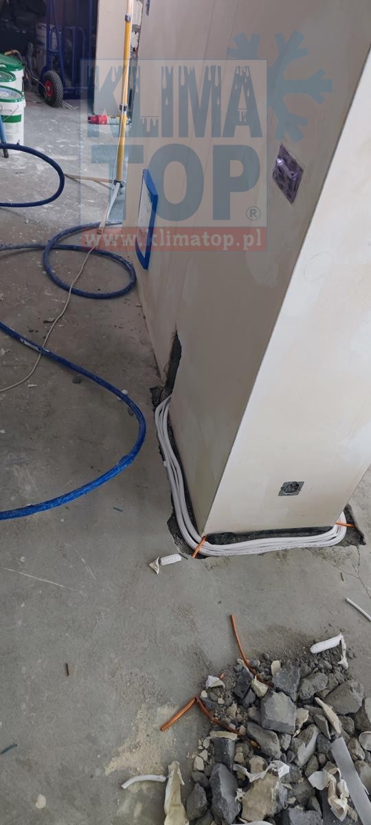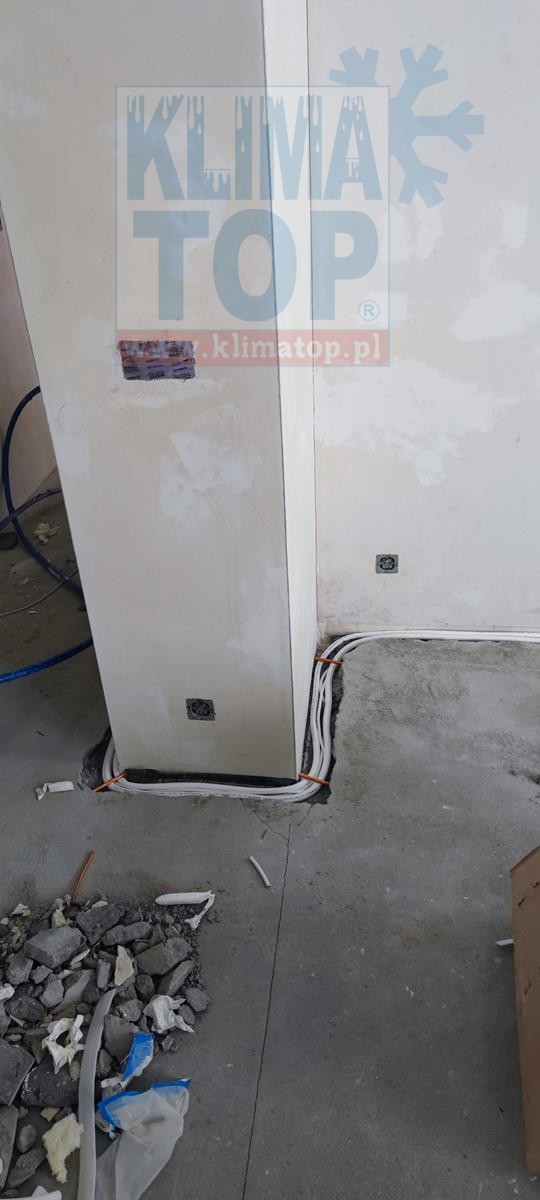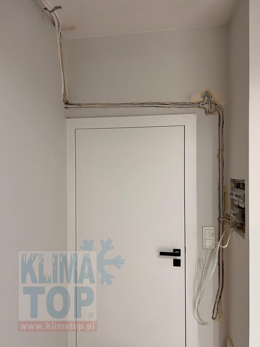 Jednostki wewnętrzne zostały zainstalowane w miejscach pierwotnie zaznaczonych papierowymi szablonami. Ze względu na planowane obniżenie sufitu, instalacja z każdego klimatyzatora została wprowadzona do przedpokoju i poprowadzona luzem przy stropie. Całość została doprowadzona do ściany szczytowej, gdzie w bruździe w ścianie została sprowadzona w dół, a następnie przeprowadzona na balkon, celem podłączenia do agregatu zewnętrznego posadowionego na posadzce. Skropliny zostały odprowadzone oddzielnie grawitacyjnie do pralni, gdzie zostaną podłączone nad syfon po uporaniu się z remontem mieszkania.