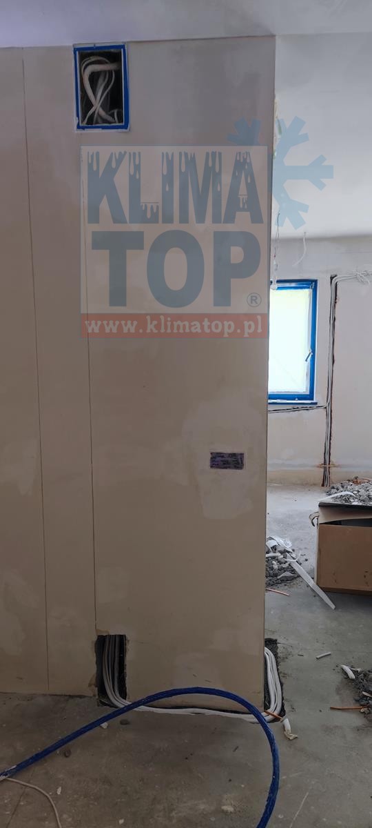 Jednostka wewnętrzna została zainstalowana na ścianie szczytowej, między oknami. Instalacja chłodnicza została sprowadzona w bruździe w ścianie pionowo w dół, a następnie przeprowadzona na balkon celem podłączenia do agregatu zewnętrznego posadowionego na posadzce. Instalacja skroplinowa została poprowadzona oddzielną bruzdą prowadzoną ze spadkiem nad syfon przyszłego zlewozmywaka w kuchni.