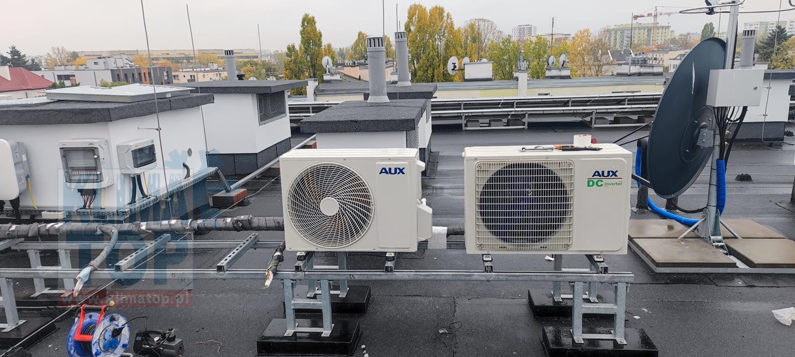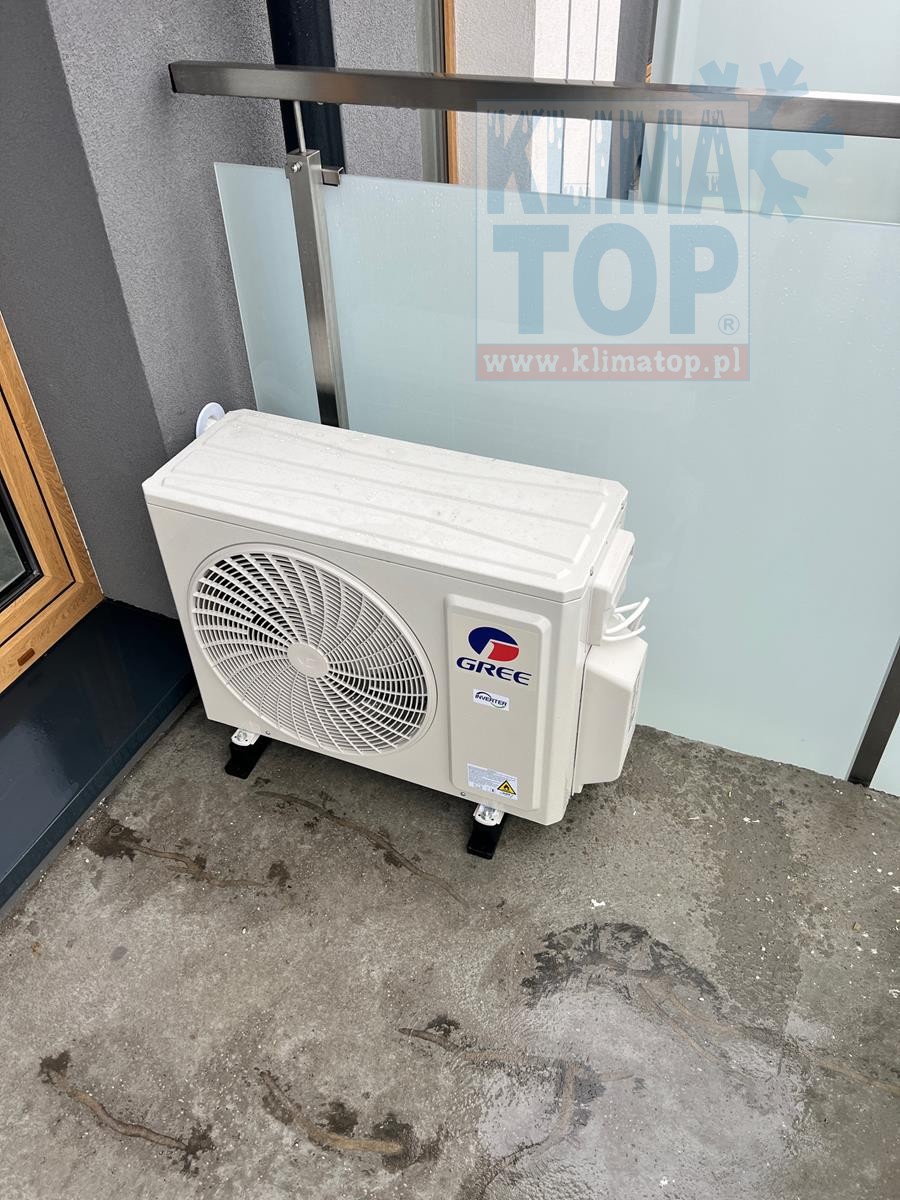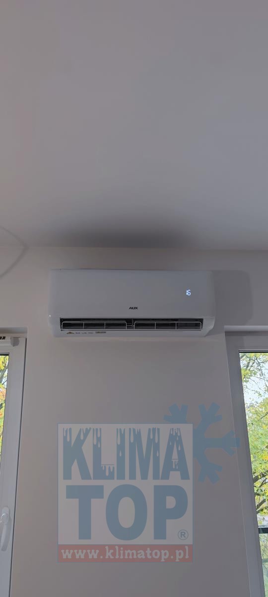 Montaż klimatyzatora AUX serii AUX Premium Grey, model AUX-12QB (moc chłodnicza 3,5 kW), obsługującego salon o powierzchni 26 m2 zlokalizowany na podwyższonym parterze.