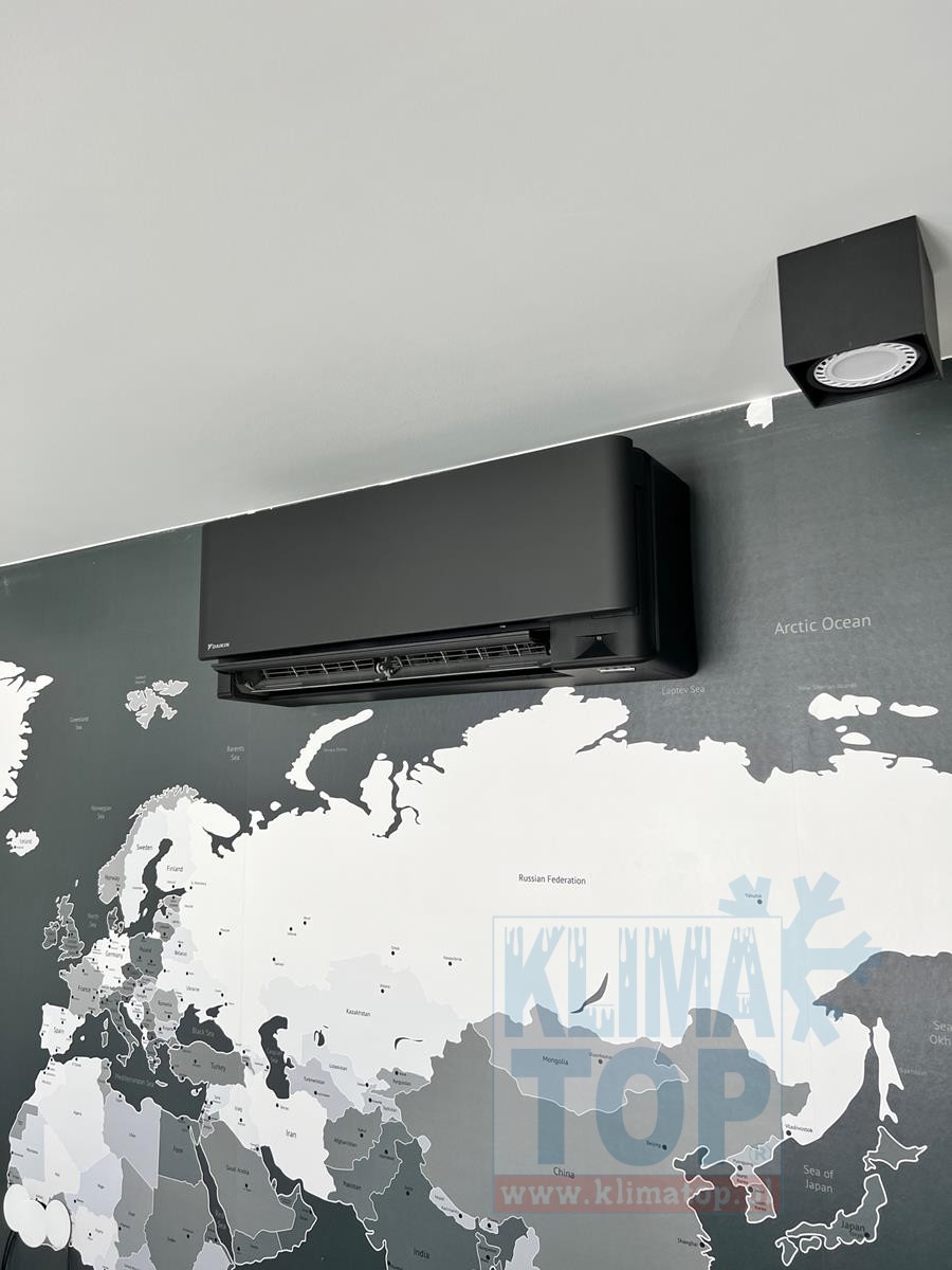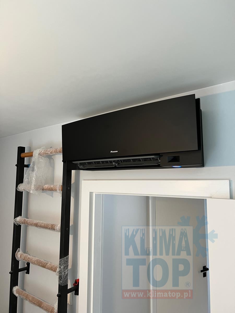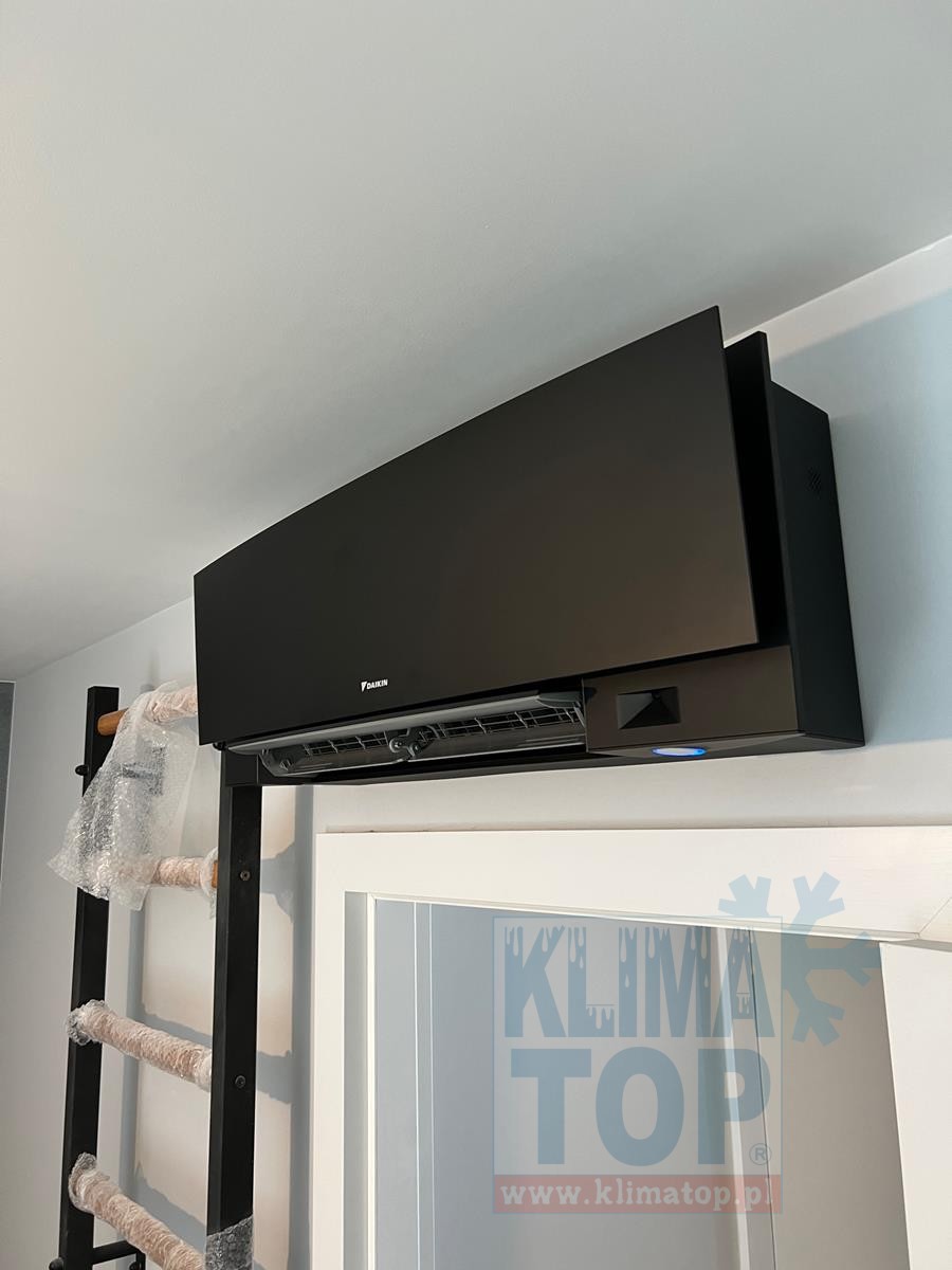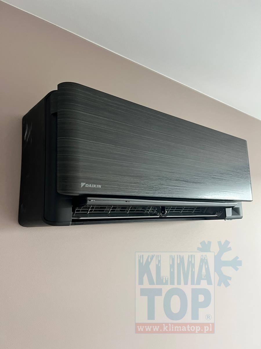 Montaż klimatyzatora Daikin serii Daikin Stylish, model FTXA-35BT (czarne drewno) (moc chłodnicza 3,5 kW), obsługującego salon z aneksem kuchennym o łącznej powierzchni 30 m2.