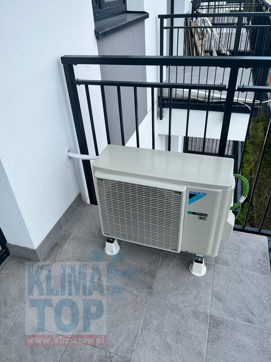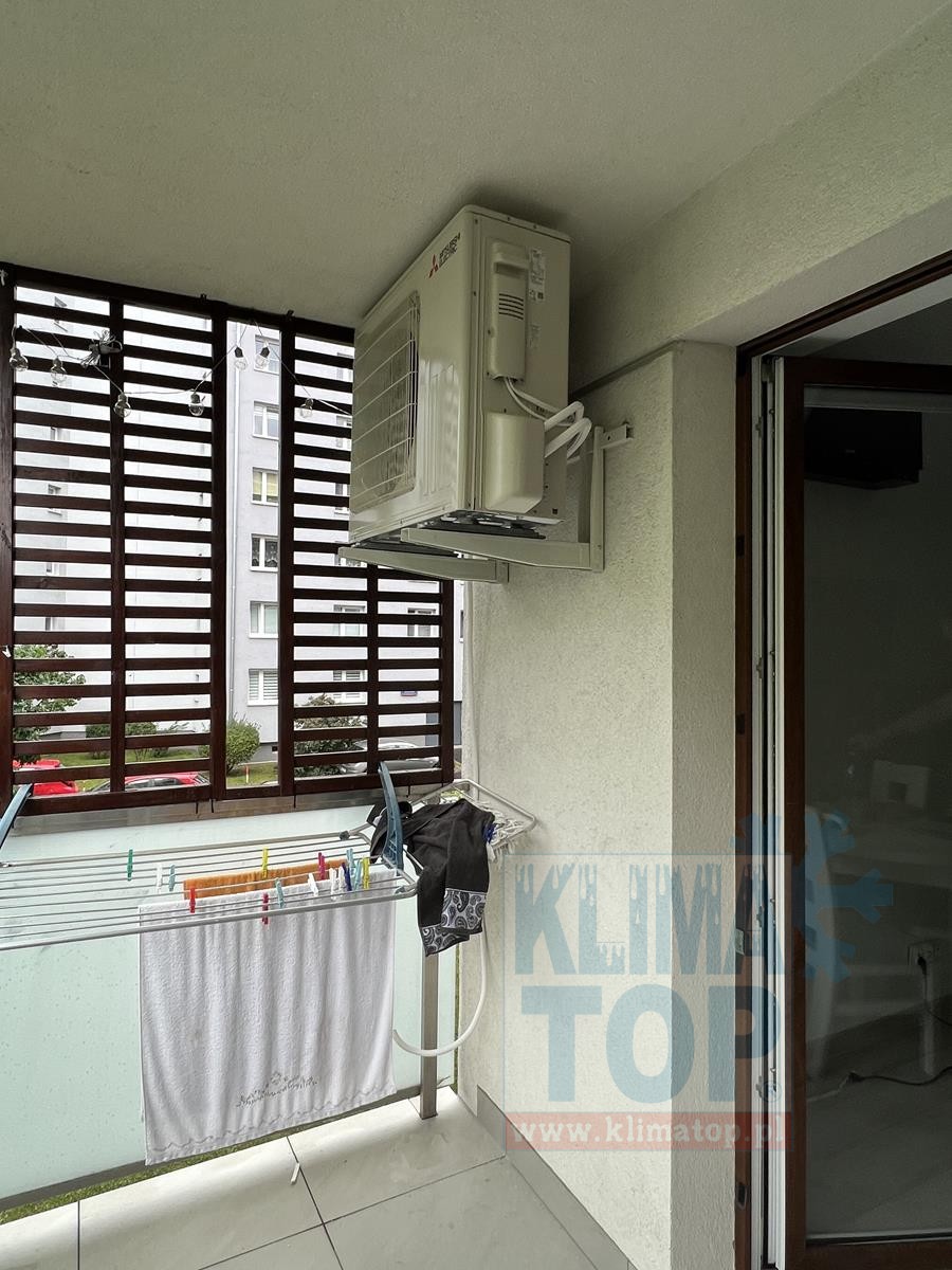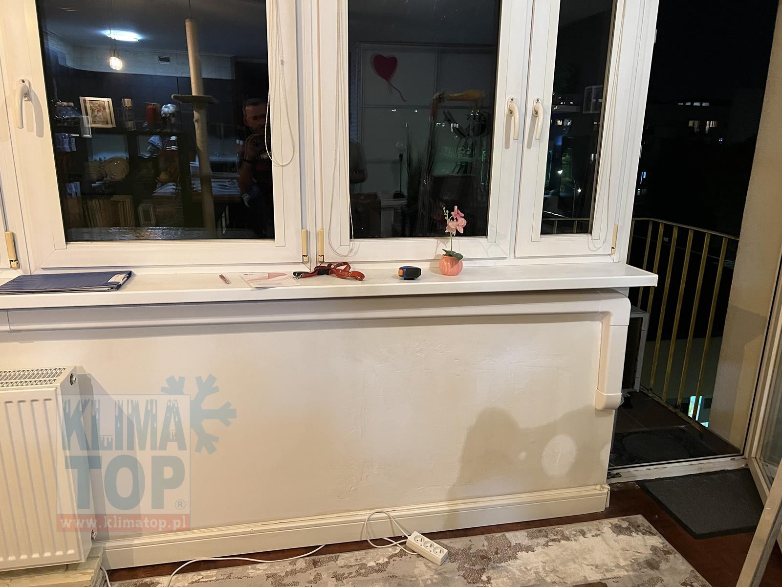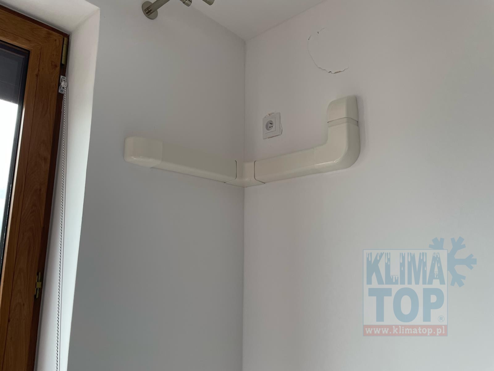 Jednostka wewnętrzna została zainstalowana na ścianie bocznej pomieszczenia. Instalacje (chłodnicza i skroplinowa) zostały poprowadzone w pomieszczeniu w maskownicy (z ominięciem grzejników) i wyprowadzone na zewnątrz, w obrysie balkonu. Tam zostały sprowadzone w dół. Rury freonowe zostały podłączone do agregatu zawieszonego po zewnętrznej stronie balkonu, a rurka skroplinowa doprowadzona ze spadkiem na krawędź balkonu - woda będzie swobodnie kapać na poziom gruntu.