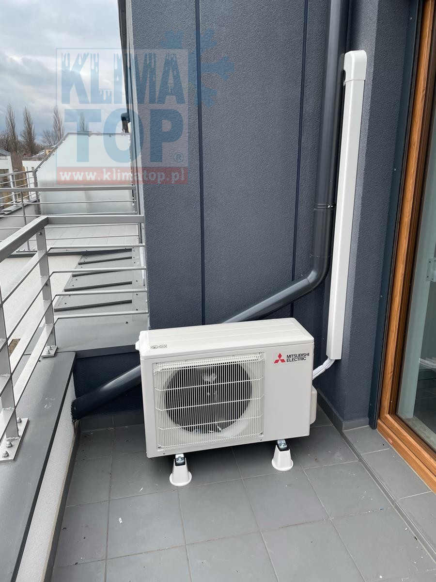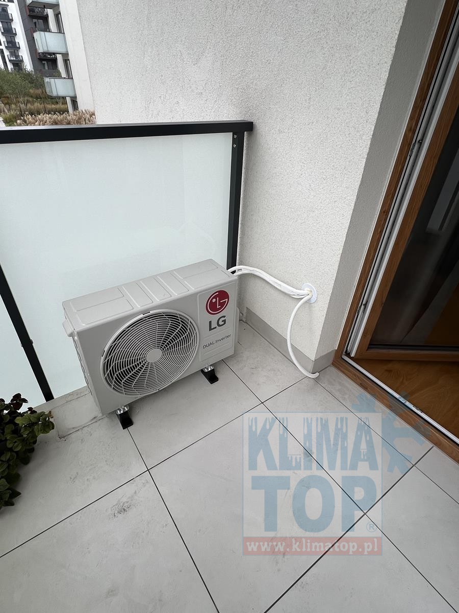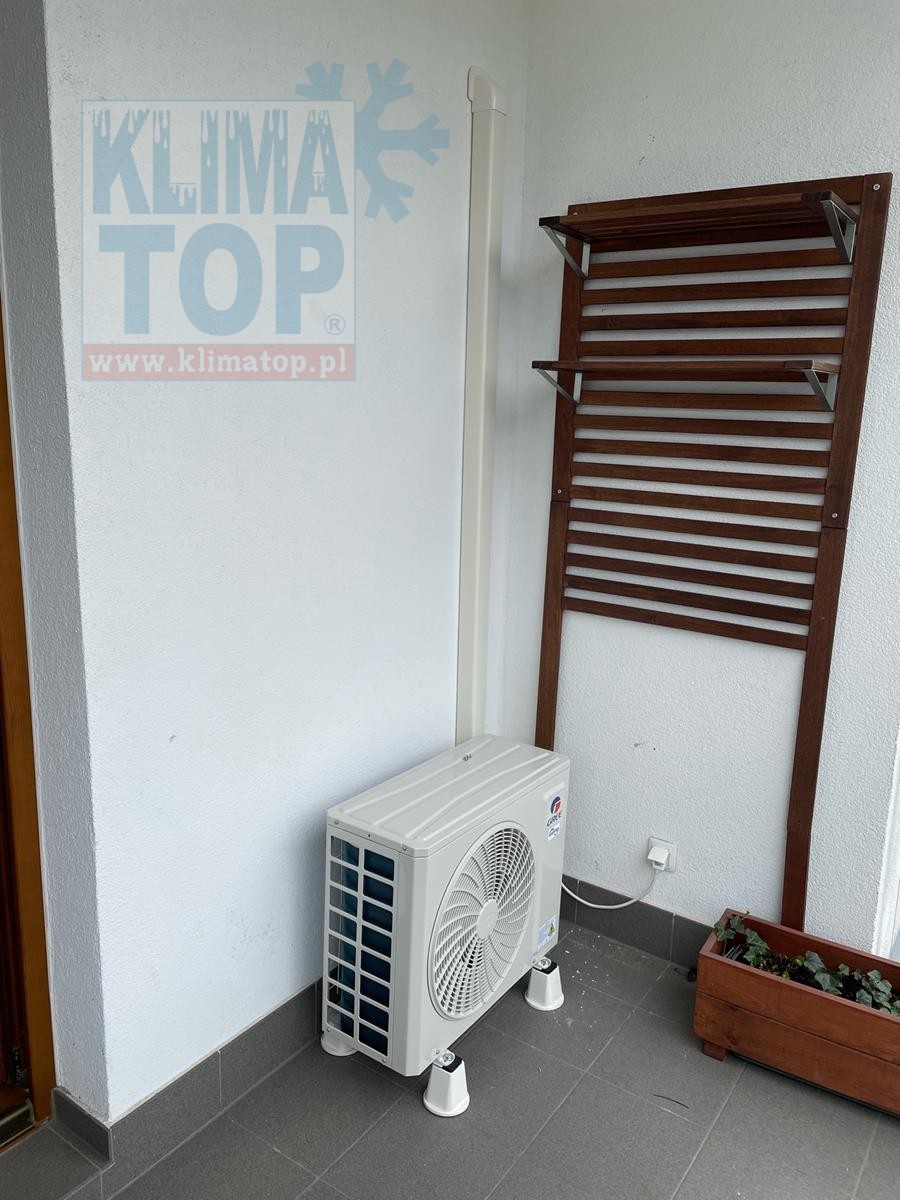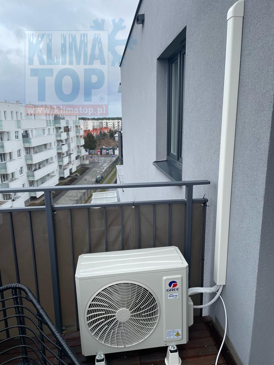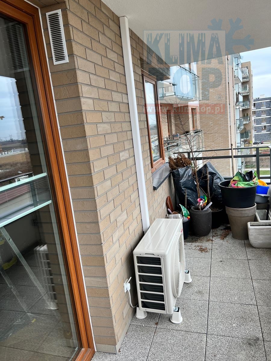 Jednostka wewnętrzna została zainstalowana na ścianie szczytowej, dzielącej mieszkanie od balkonu. Instalacja chłodnicza i skroplinowa zostały przeprowadzone za "plecami" klimatyzatora na balkon, gdzie zostały sprowadzone w maskownicy pionowo w dół, celem podłączenia do agregatu zewnętrznego posadowionego na posadzce balkonu. Skropliny będą odpływać do kanalizacji znajdującej się pod deskowaniem balkonu.