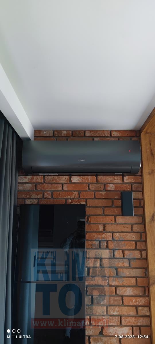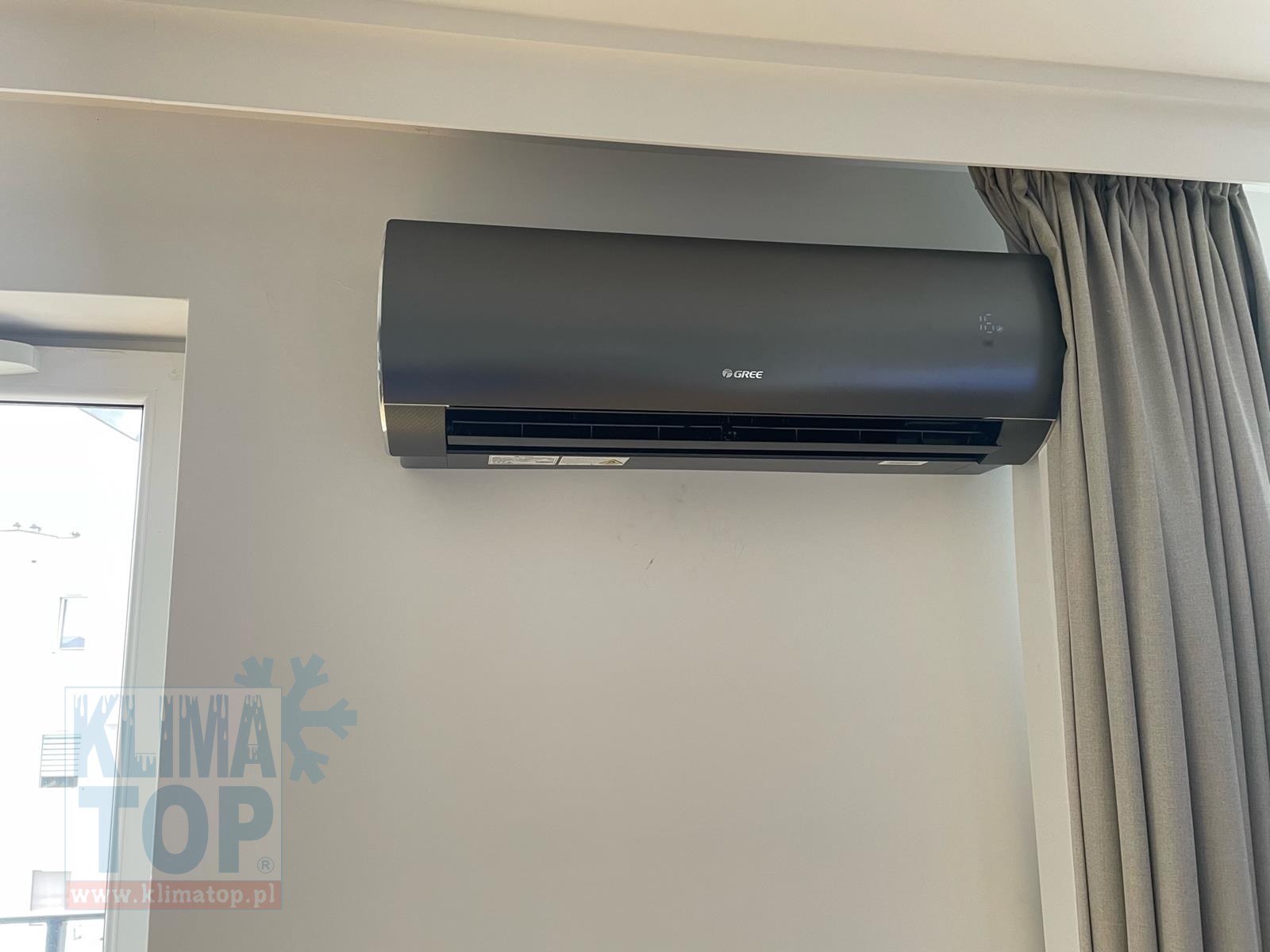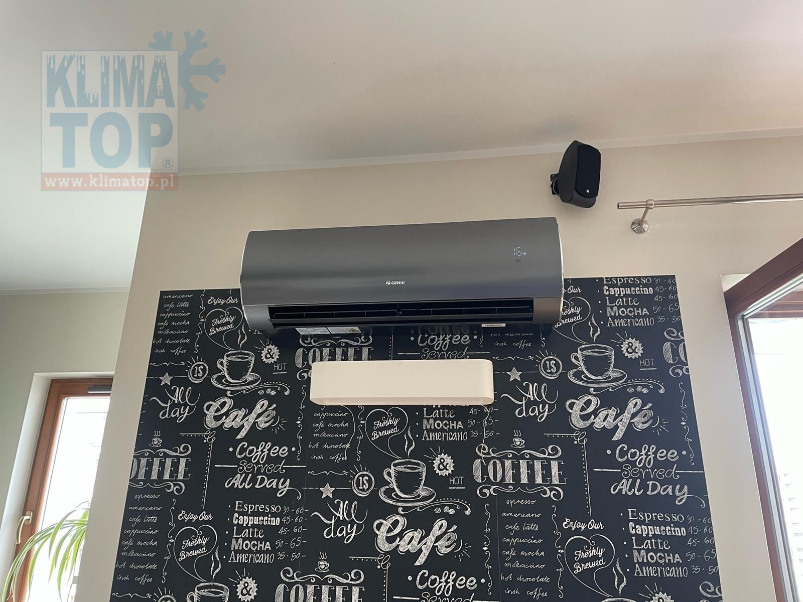 Montaż klimatyzatora Gree serii Fairy, model FA24D (grafitowy) (moc chłodnicza 7,0 kW), obsługującego salon z kuchnią i przedpokojem o łącznej powierzchni około 60 m2.