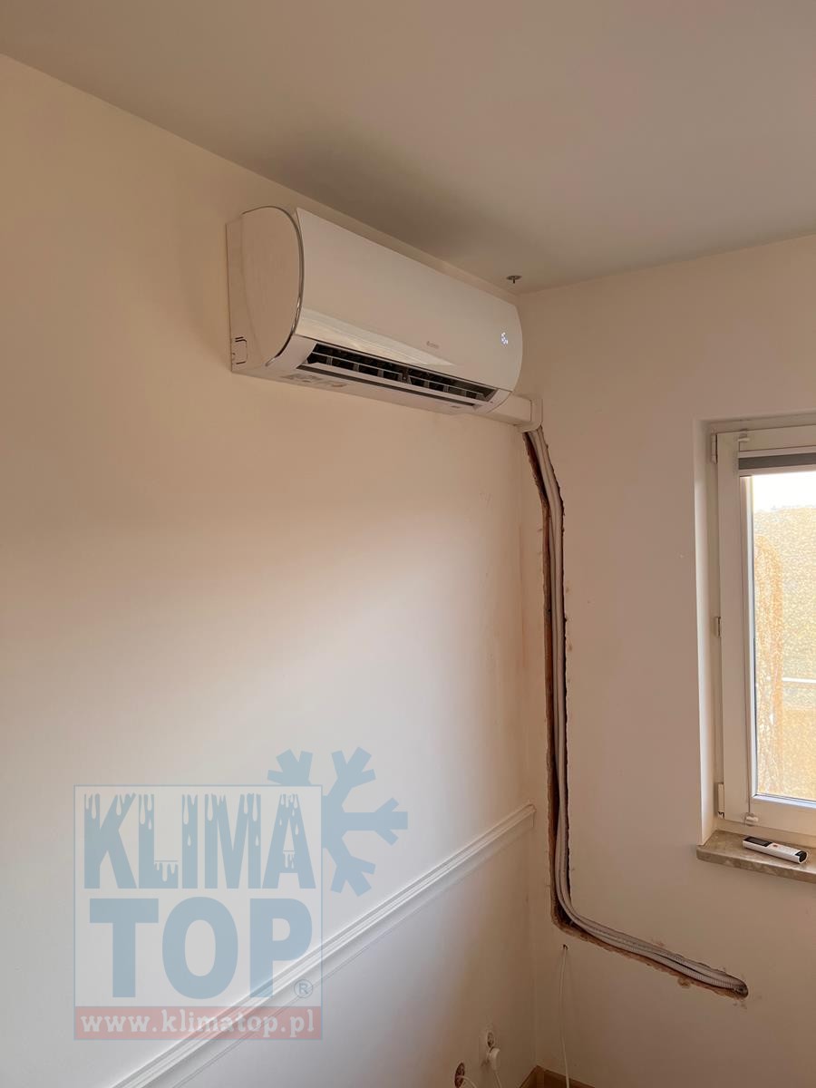 Jednostka wewnętrzna została zainstalowana na ścianie szczytowej. Instalacja została sprowadzona w bruździe w ścianie w dół, a następnie przeprowadzona na balkon, celem podłączenia do agregatu zewnętrznego. Skropliny zostały odprowadzone razem z instalacją chłodniczą na balkon - woda będzie spływać do zbiornika zlokalizowanego obok agregatu zewnętrznego.