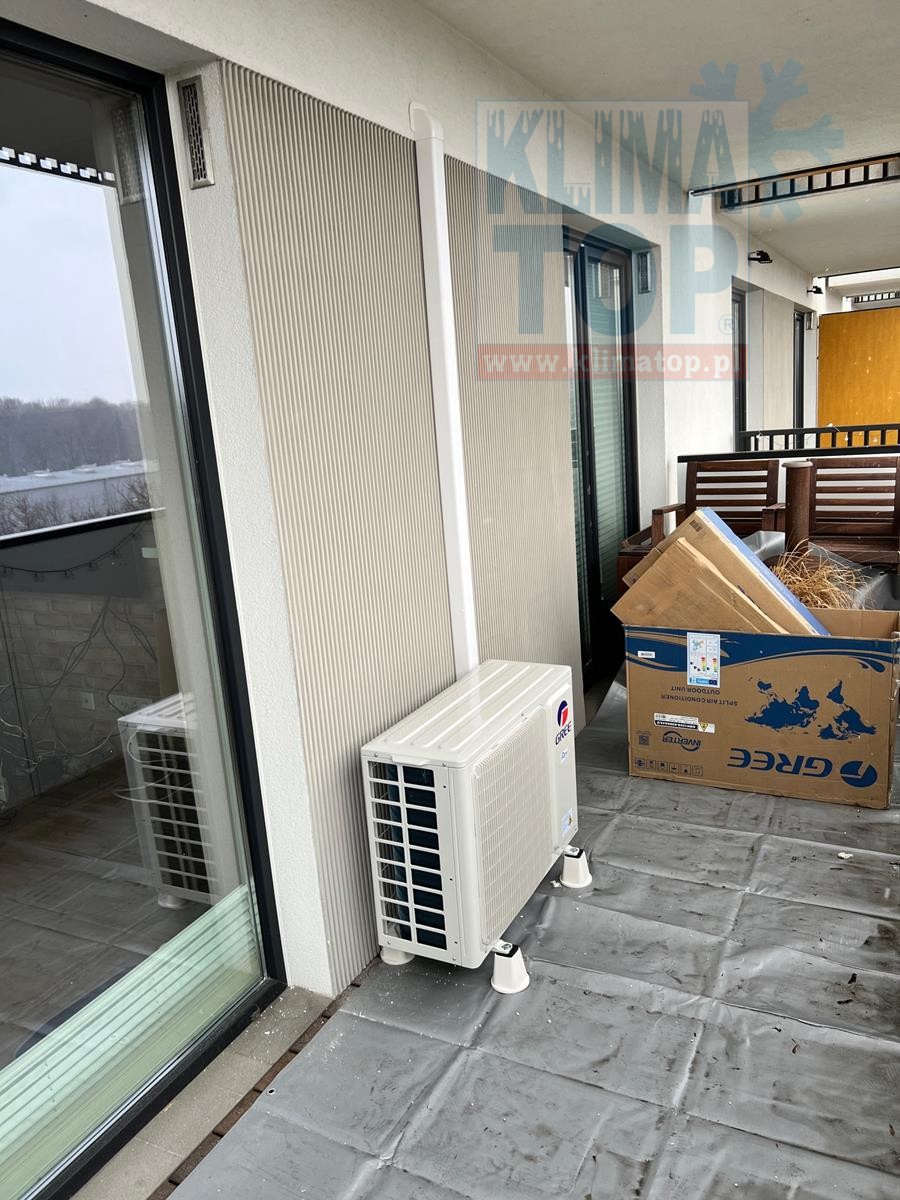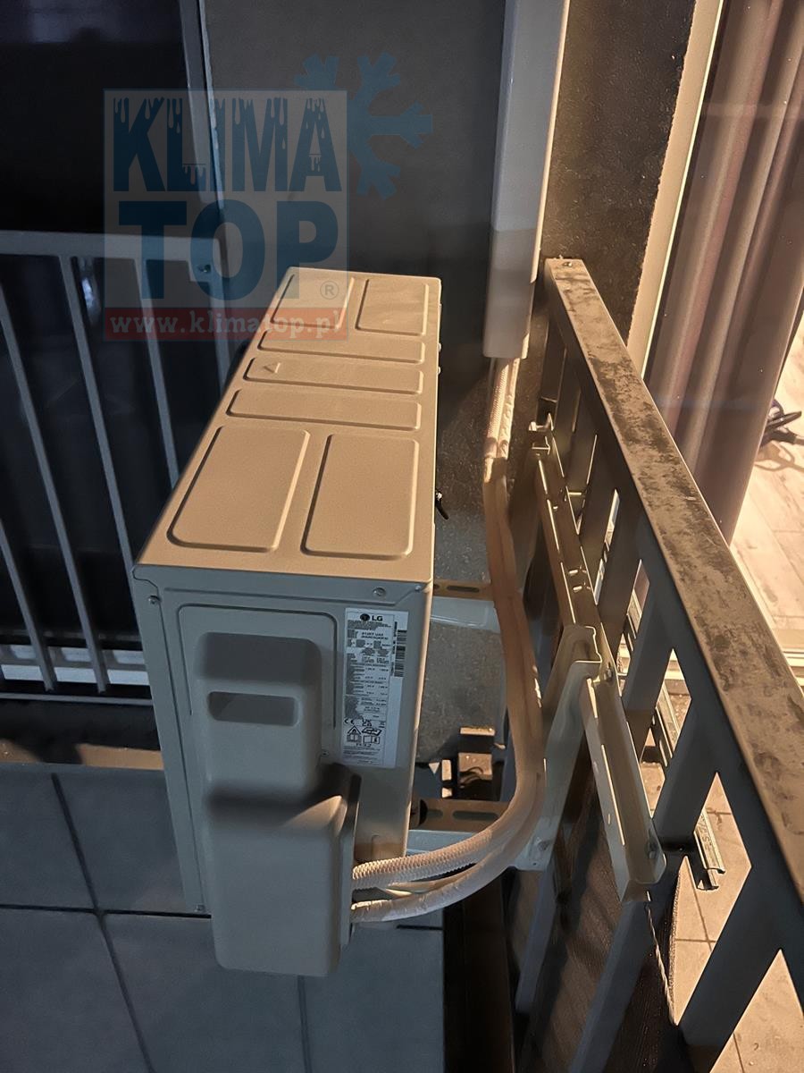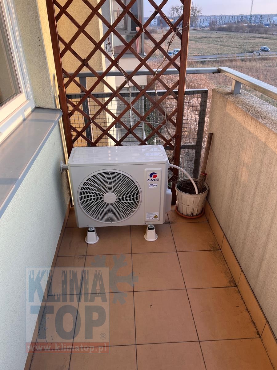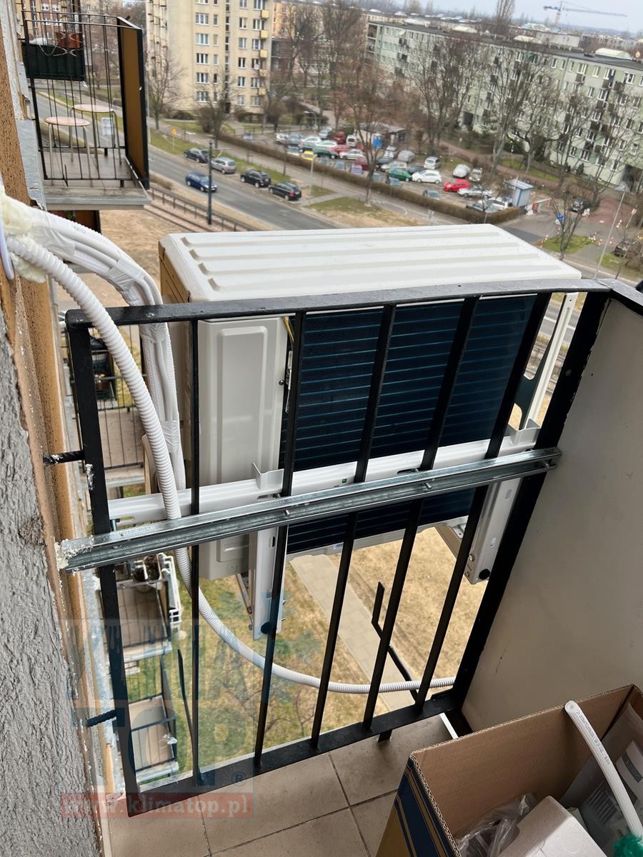 Jednostka wewnętrzna została zainstalowana na ścianie szczytowej, dzielącej mieszkanie od balkonu. Instalacja chłodnicza i skroplinowa zostały przeprowadzone za "plecami" klimatyzatora na balkon, gdzie zostały sprowadzone w maskownicy pionowo w dół, celem podłączenia do agregatu zewnętrznego posadowionego na posadzce. Skropliny będą zbierane do zbiornika zlokalizowanego obok agregatu zewnętrznego. Do zasilania wykorzystano gniazdko znajdujące się na balkonie.