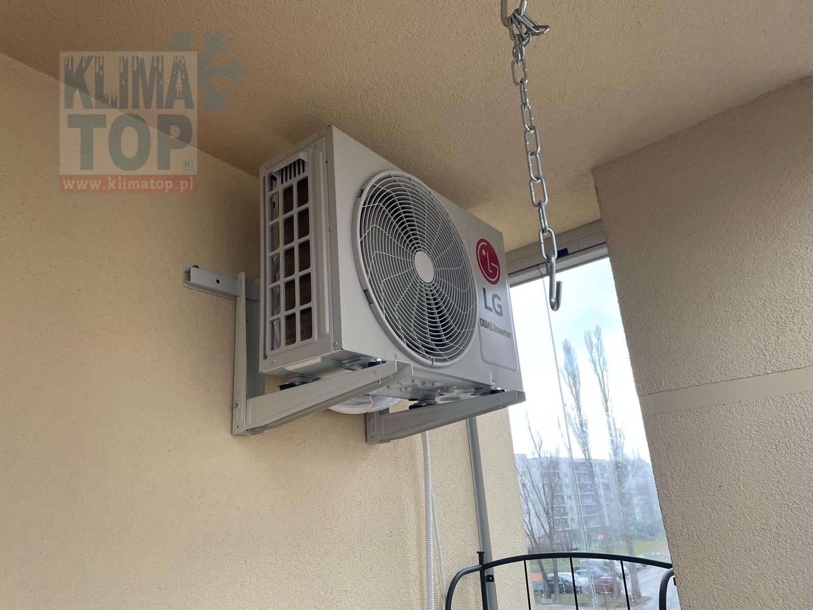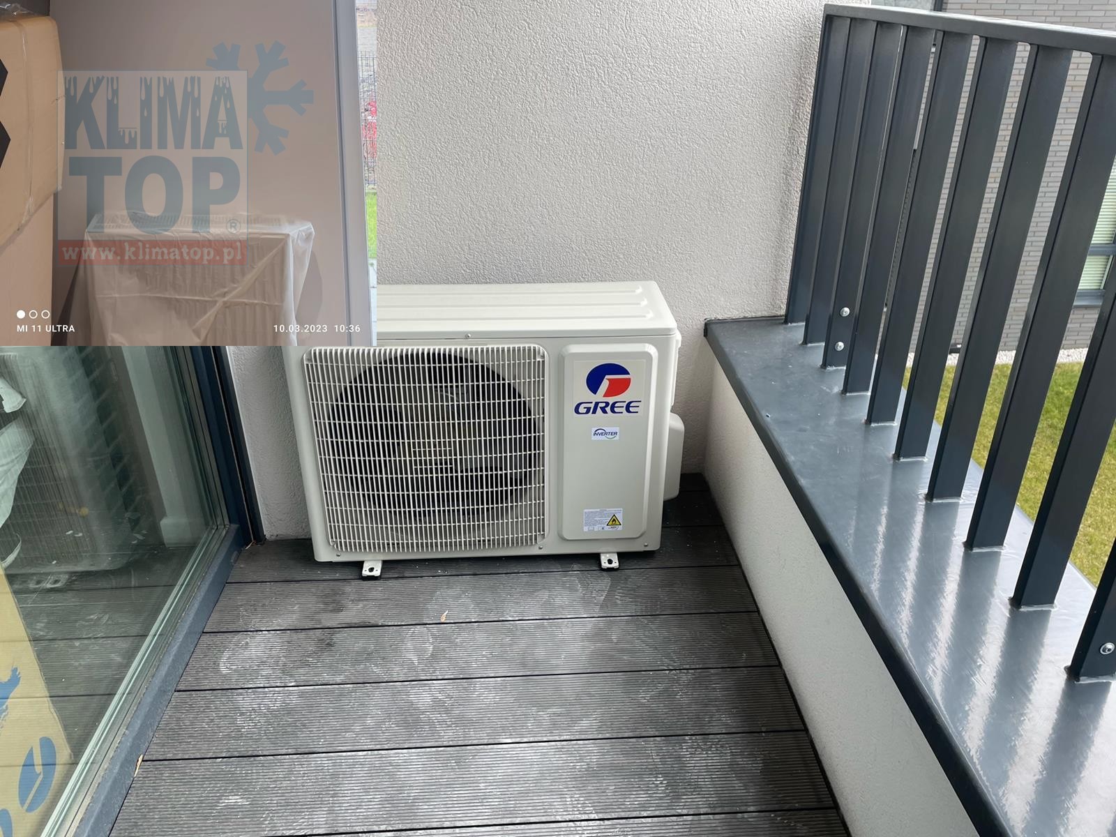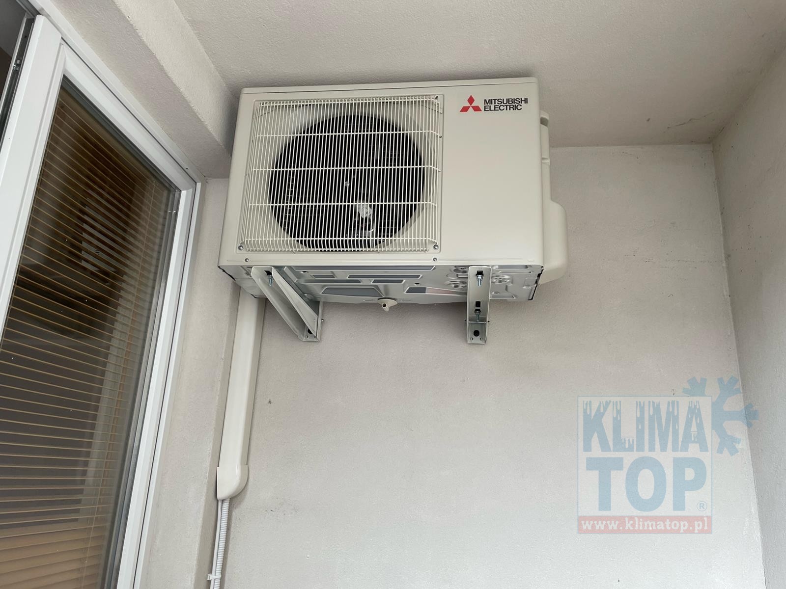 Jednostka wewnętrzna została zainstalowana na ścianie szczytowej, dzielącej mieszkanie od balkonu. Instalacja chłodnicza i skroplinowa zostały przeprowadzone za "plecami" klimatyzatora na balkon, gdzie zostały sprowadzone w maskownicy pionowo w dół, celem podłączenia do agregatu zewnętrznego posadowionego na posadzce. Skropliny będą zbierane do zbiornika zlokalizowanego obok agregatu zewnętrznego. Do zasilania wykorzystano gniazdko znajdujące się na balkonie.