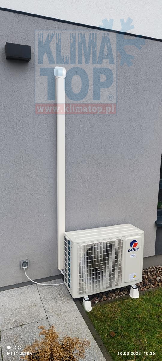 Jednostka wewnętrzna została zainstalowana na ścianie szczytowej, na ozdobnych cegiełkach. Instalacja została przeprowadzona za "plecami" klimatyzatora na zewnątrz, gdzie została sprowadzona w maskownicy (8x6 cm) w dół, a następnie podłączona do agregatu zewnętrznego posadowionego na poziomie gruntu. Skropliny zostały odprowadzone razem z instalacją chłodniczą na zewnątrz - woda będzie swobodnie spływać na grunt.