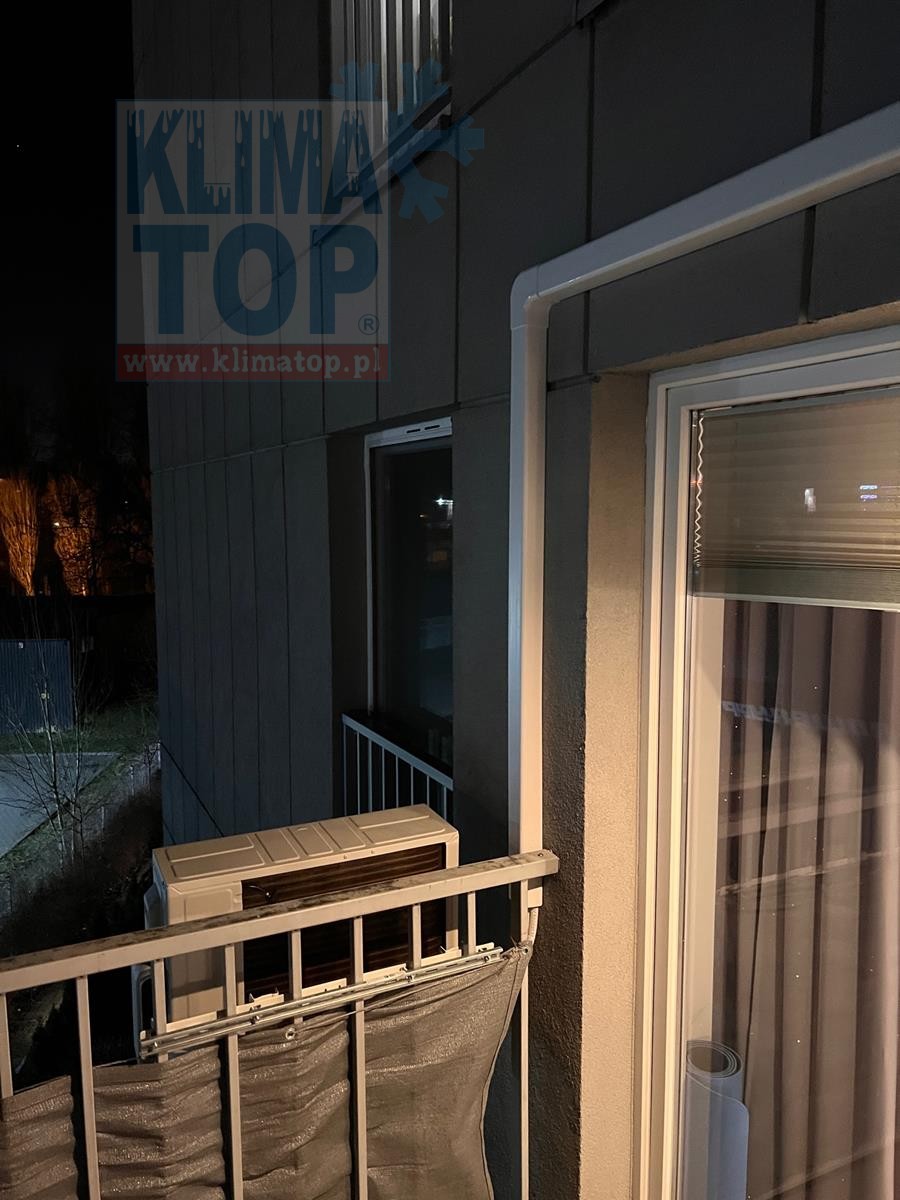 Jednostka wewnętrzna została zainstalowana na ścianie szczytowej, obok drzwi balkonowych. Instalacja została doprowadzona w bruździe w ścianie do miejsca, w którym za ścianą zaczynał się balkon. Następnie została przeprowadzona przez ścianę i w maskownicach doprowadzona po elewacji na przeciwległy koniec balkonu, celem jej sprowadzenia w dół i podłączenia do agregatu zewnętrznego podwieszonego po zewnętrznej stronie balustrady balkonowej. Skropliny zostały wyprowadzone w miejscu przejścia instalacji chłodniczej z mieszkania - woda będzie swobodnie kapać z balkonu w dół.
