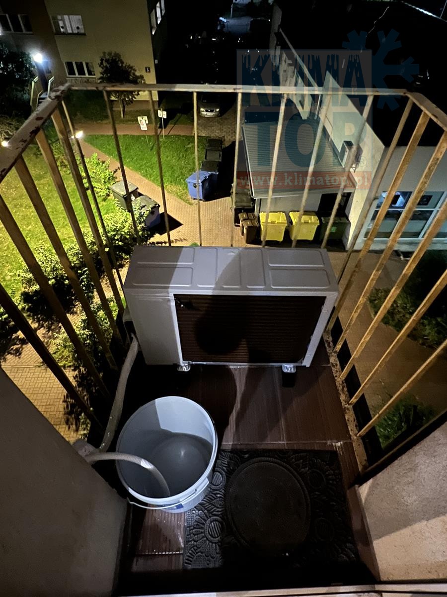 Jednostka wewnętrzna została zainstalowana na ścianie szczytowej, a zewnętrzna podwieszona bezpośrednio za jej "plecami". To najprostszy montaż standardowy. Skropliny zostały odprowadzone rurką sprowadzoną po elewacji balkonu w dół - woda będzie zbierana do zbiornika.