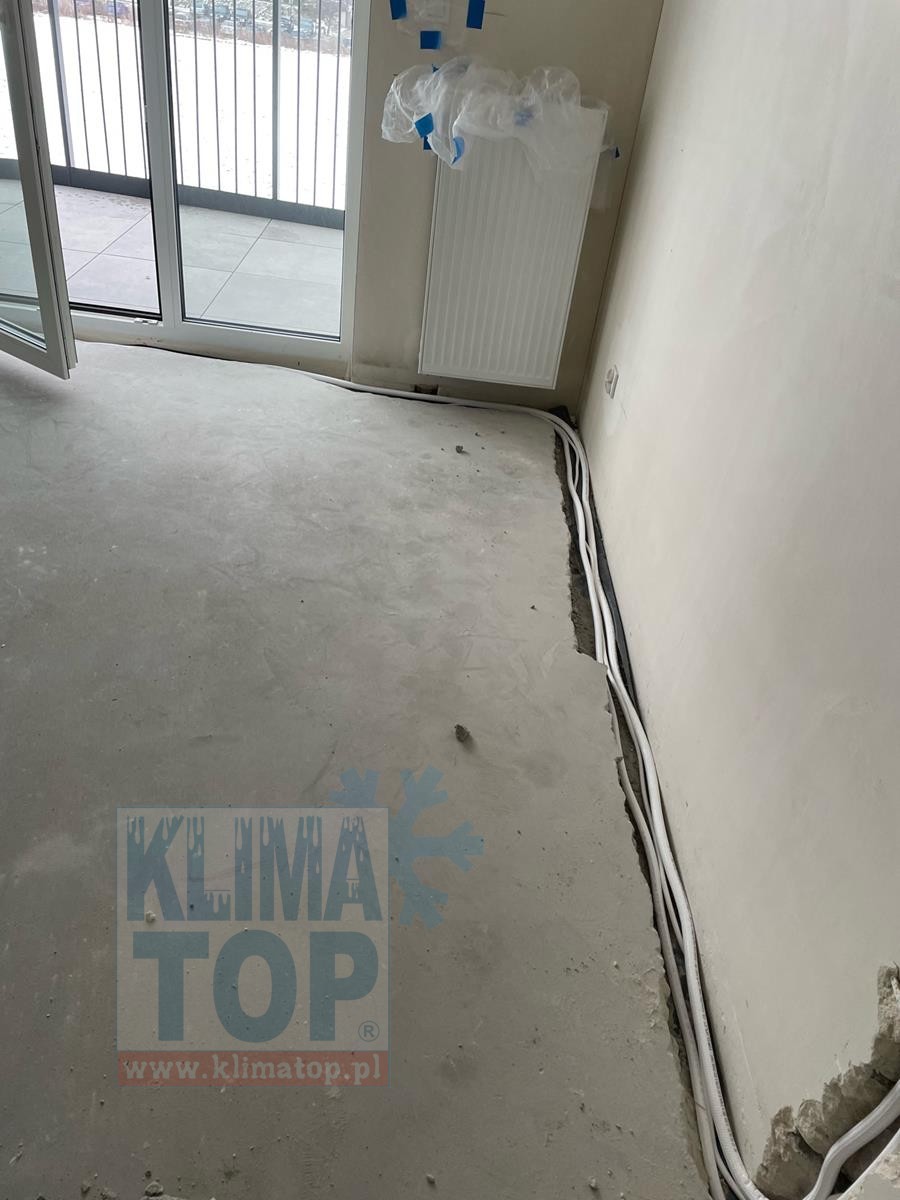 Jednostka wewnętrzna została zainstalowana na ścianie bocznej, naprzeciwko drzwi do sypialni. Instalacja została sprowadzona w bruździe w ścianie w dół, a następnie w bruździe w wylewce podłogowej doprowadzona do narożnika salonu, gdzie została wyprowadzona (po uprzednim podniesieniu, by nie uszkodzić hydroizolacji balkonu) na balkon i podłączona do agregatu zewnętrznego posadowionego na posadzce. Skropliny zostały odprowadzone oddzielną bruzdą wykutą w ścianie ze spadkiem nad przyszły syfon zlewozmywaka w kuchni.