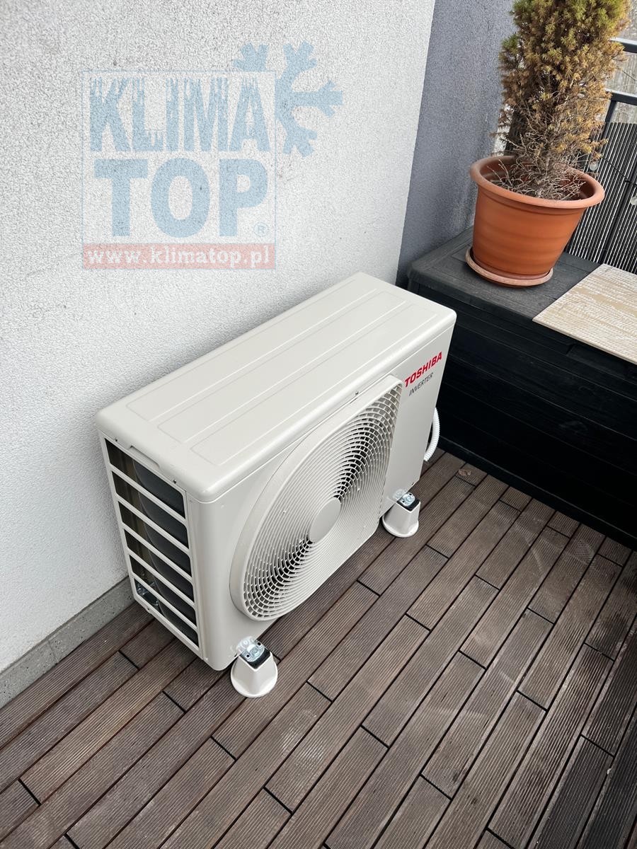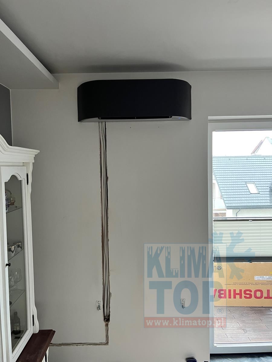 Montaż klimatyzatora Toshiba serii Haori, model RAS-B16N4KVRG (moc chłodnicza 5,0 kW), obsługującego salon z kuchnią, otwarty na przedpokój, o łącznej powierzchni 43 m2.