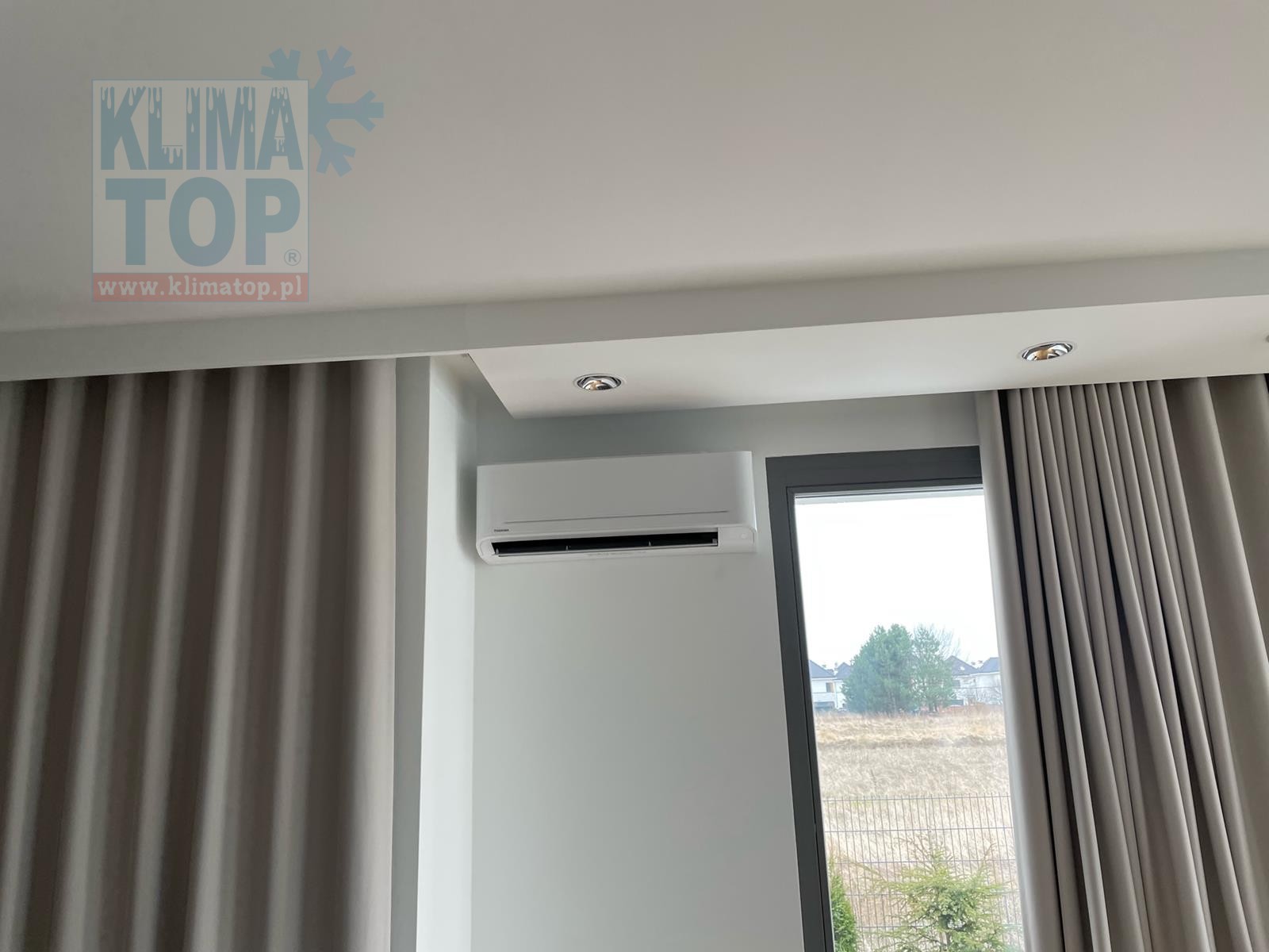 Montaż klimatyzatora Toshiba serii Seiya 2, model RAS-18E2KVG (moc chłodnicza 5,0 kW), obsługującego salon z kuchnią o łącznej powierzchni 44 m2.