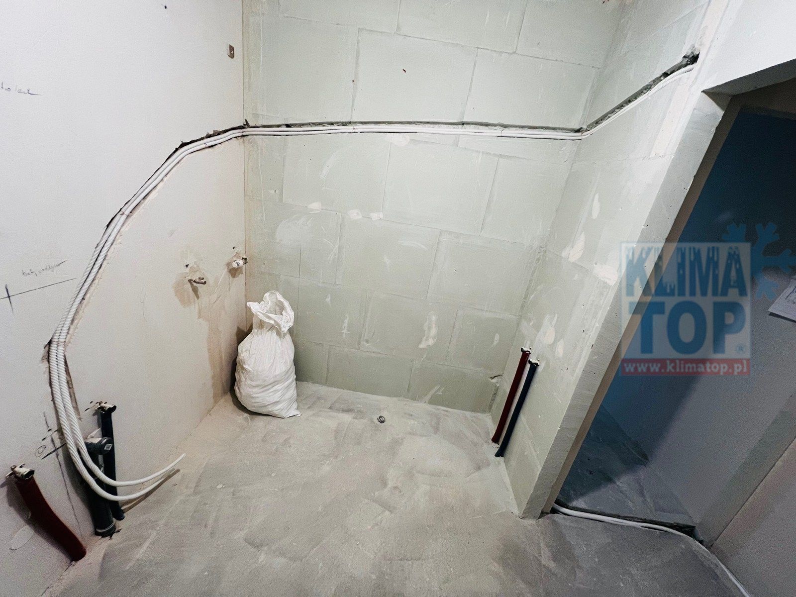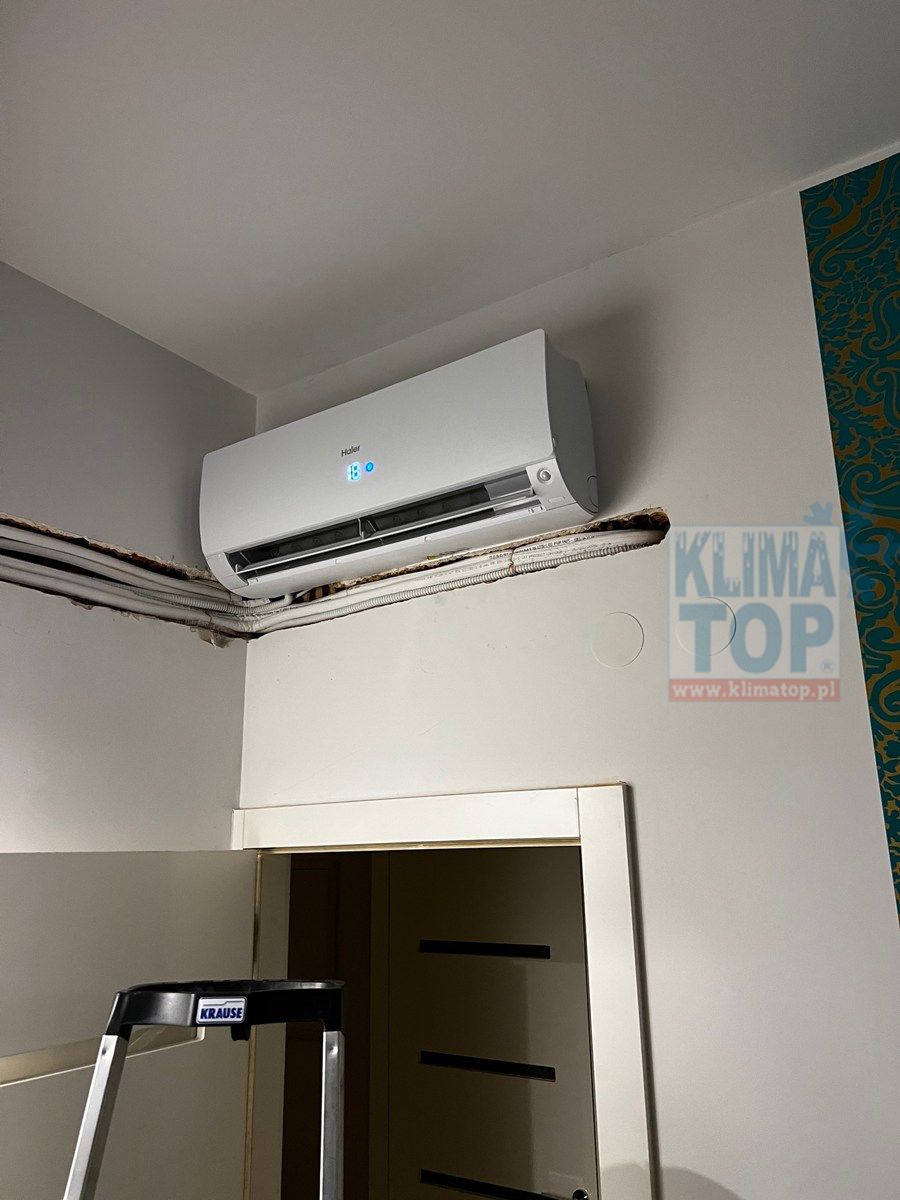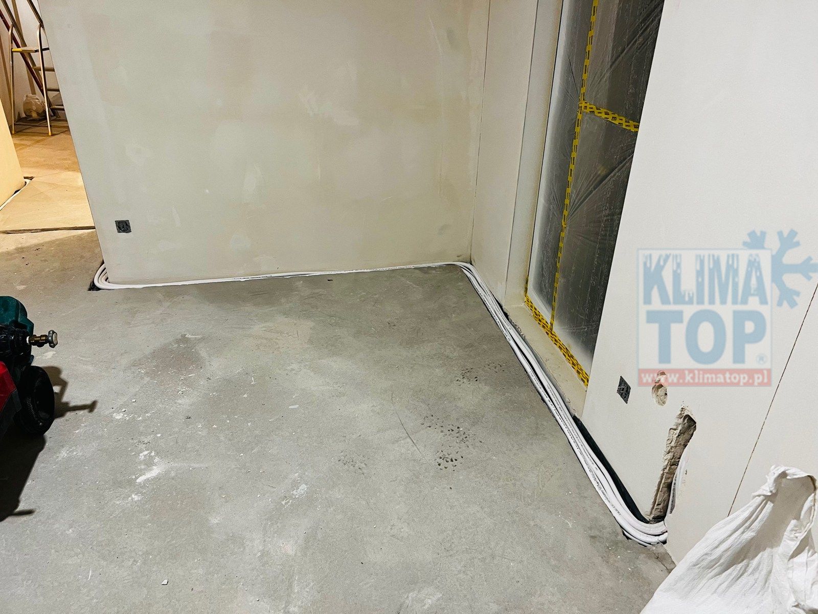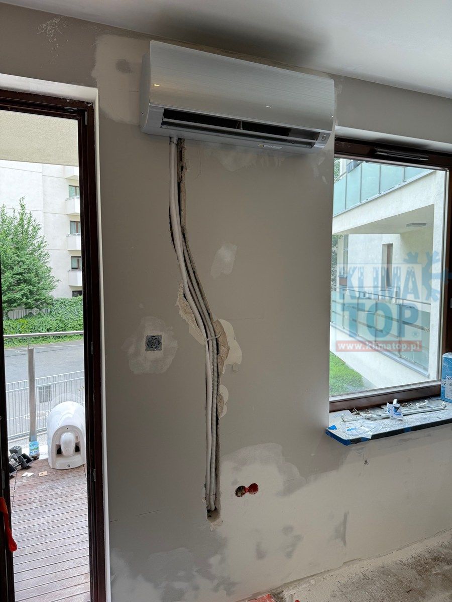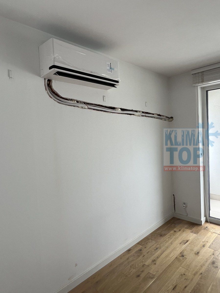 Montaż został zrealizowany dwuetapowo ze względu na deweloperski stan mieszkania. W pierwszym etapie zostały ułożone same instalacje, a w drugim nastąpiło podłączenie i uruchomienie całego systemu. Jednostki wewnętrzne zostały zainstalowane w ustalonych miejscach, a instalacja została poprowadzona w bruzdach w ścianach i wylewce podłogowej, a następnie wyprowadzona na balkon, do agregatu zewnętrznego. Skropliny z małych pokoi zostały odprowadzone do kanalizacji w lokalu, a z salonu na balkon (do odwodnienia pod tzw. "pływającą" posadzką.