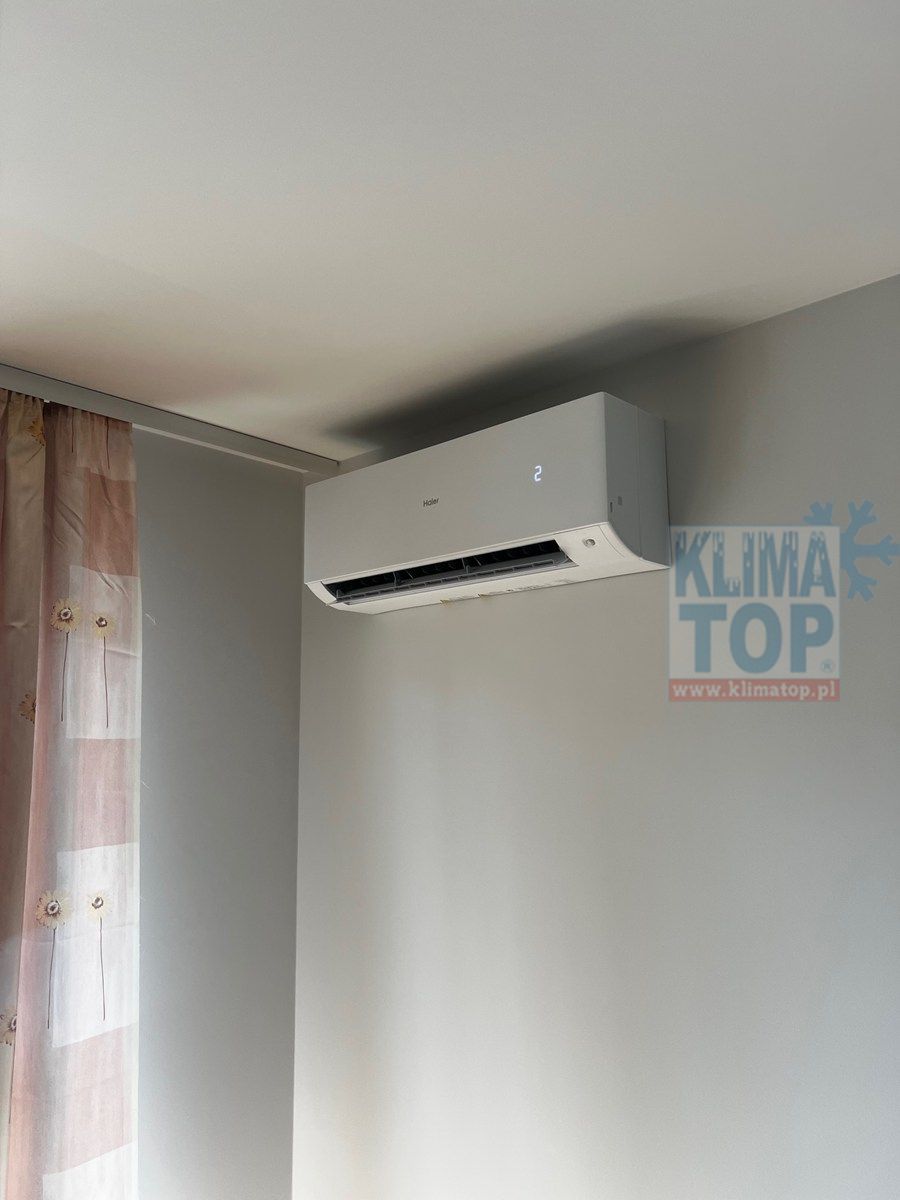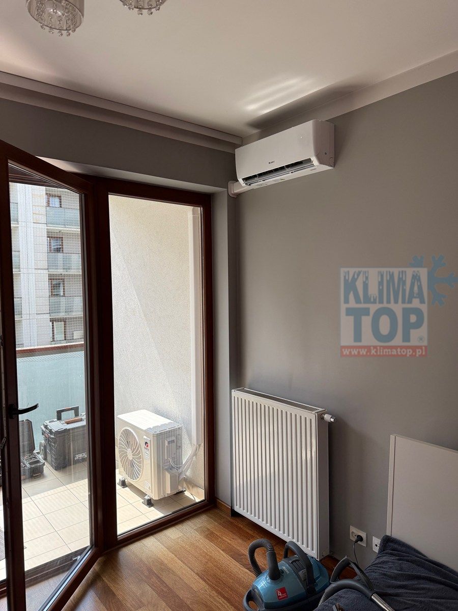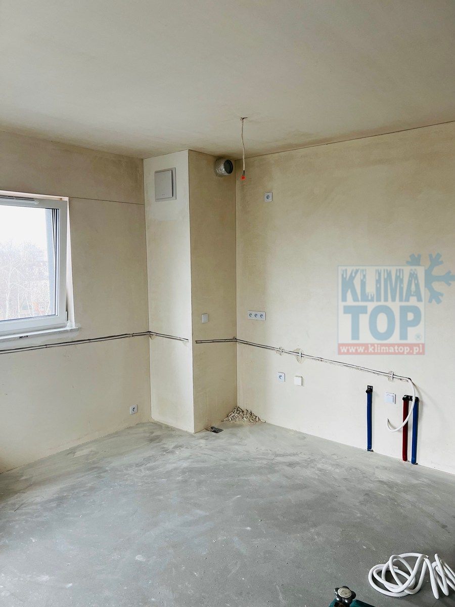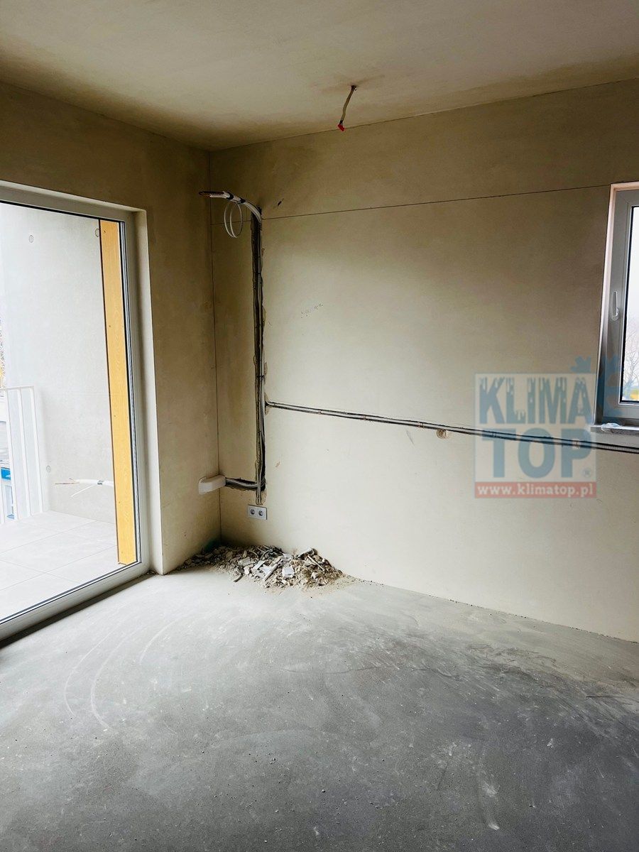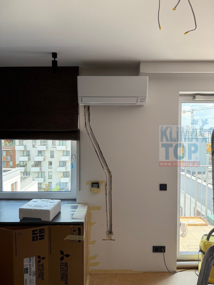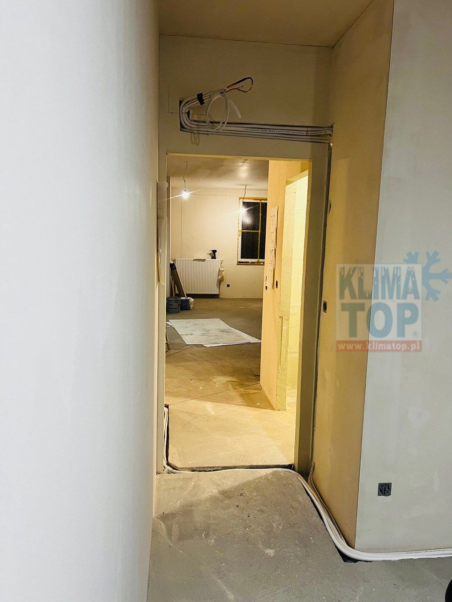 Montaż został zrealizowany dwuetapowo ze względu na deweloperski stan mieszkania. W pierwszym etapie zostały ułożone same instalacje, a w drugim nastąpiło podłączenie i uruchomienie całego systemu. Jednostki wewnętrzne zostały zainstalowane w ustalonych miejscach, a instalacja została poprowadzona w bruzdach w ścianach i wylewce podłogowej, a następnie wyprowadzona na balkon, do agregatu zewnętrznego. Skropliny z małych pokoi zostały odprowadzone do kanalizacji w lokalu, a z salonu na balkon (do odwodnienia pod tzw. "pływającą" posadzką.