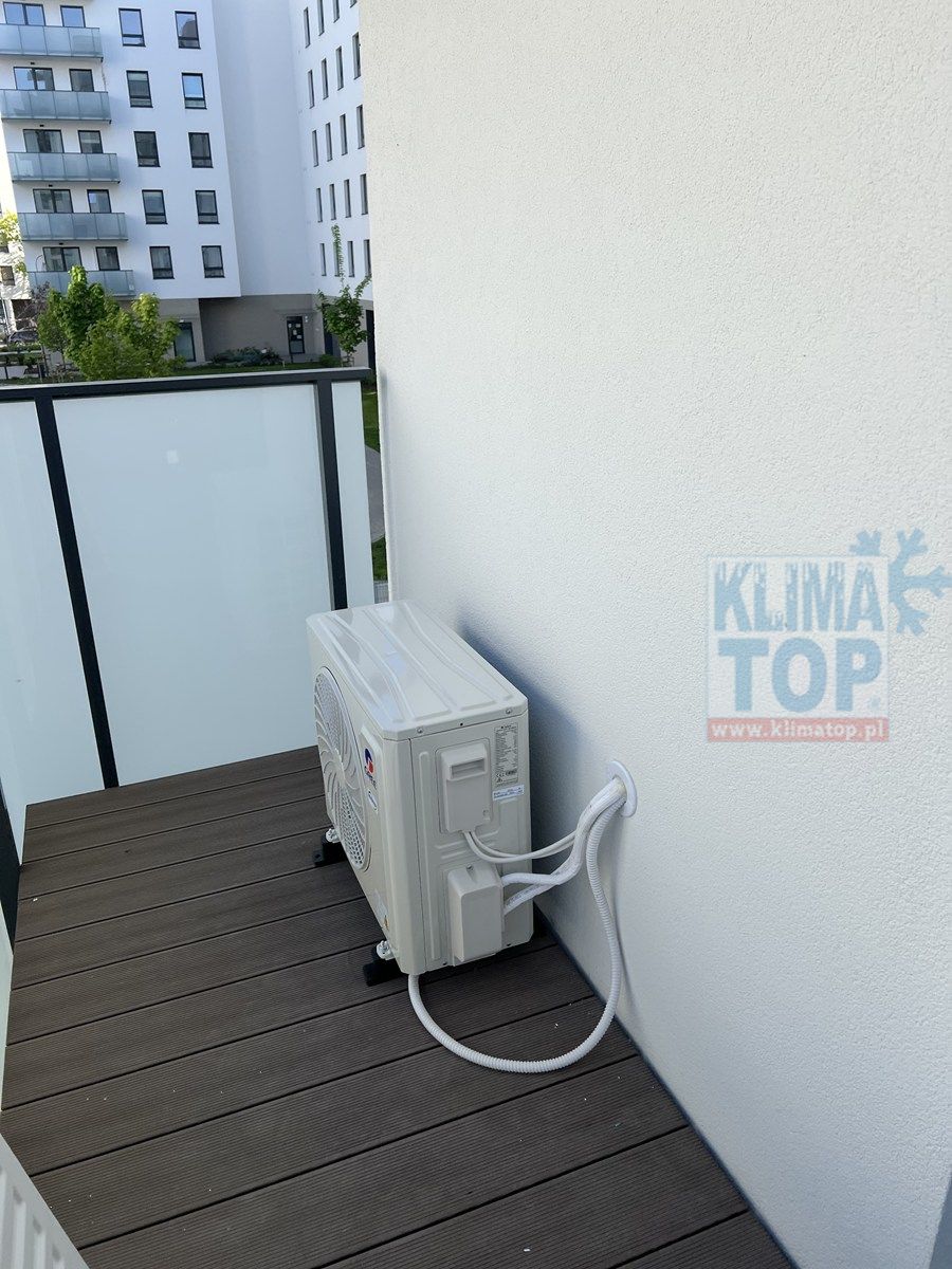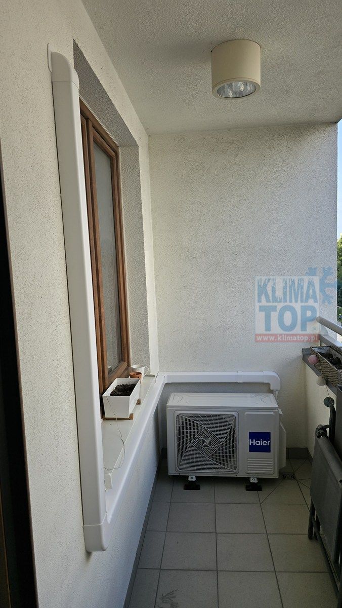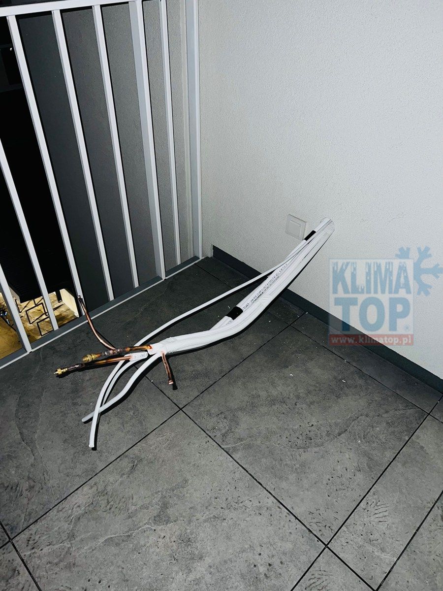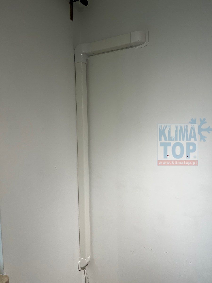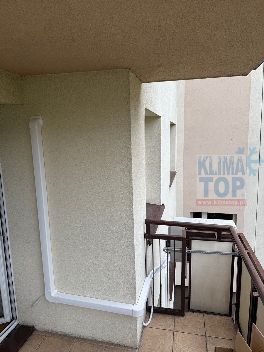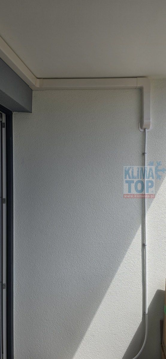 Jednostka wewnętrzna została zainstalowana na ścianie szczytowej, w nadprożu. Instalacja została przeprowadzona za "plecami" klimatyzatora na balkon (przewiert poza obrysem belki nadproża), gdzie została doprowadzona w górę i przeprowadzona w maskownicach na przeciwległy koniec balkonu celem jej sprowadzenia w dół i podłączenia do agregatu zewnętrznego posadowionego na posadzce. Skropliny zostały odprowadzone oddzielnie (rurka sprowadzona w miejscu wyprowadzenia instalacji chłodniczej na balkon) na balkon - woda będzie zbierana do zbiornika.