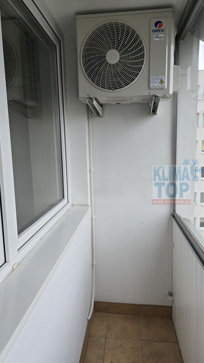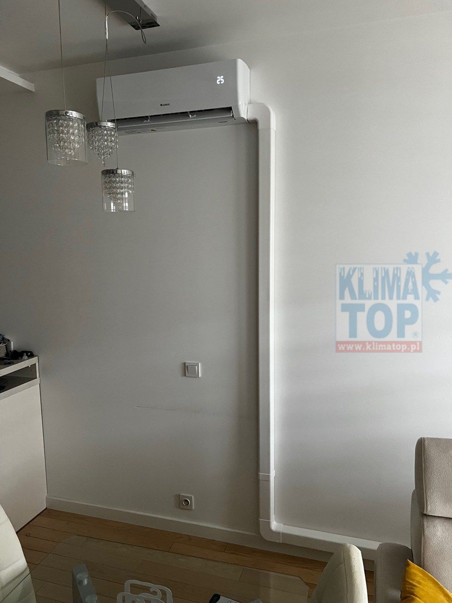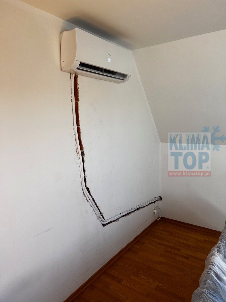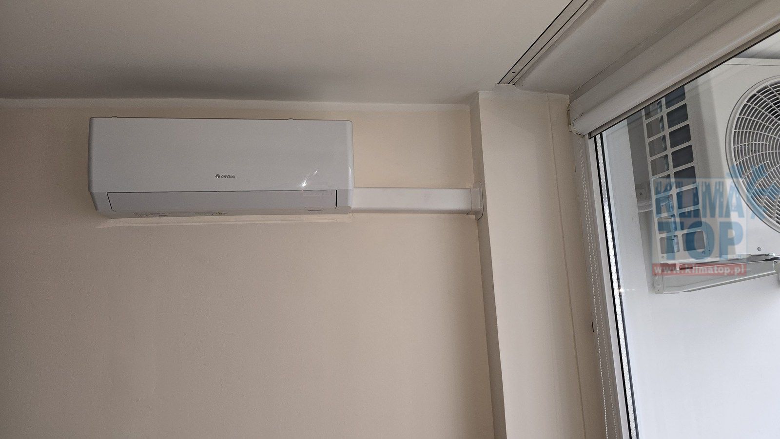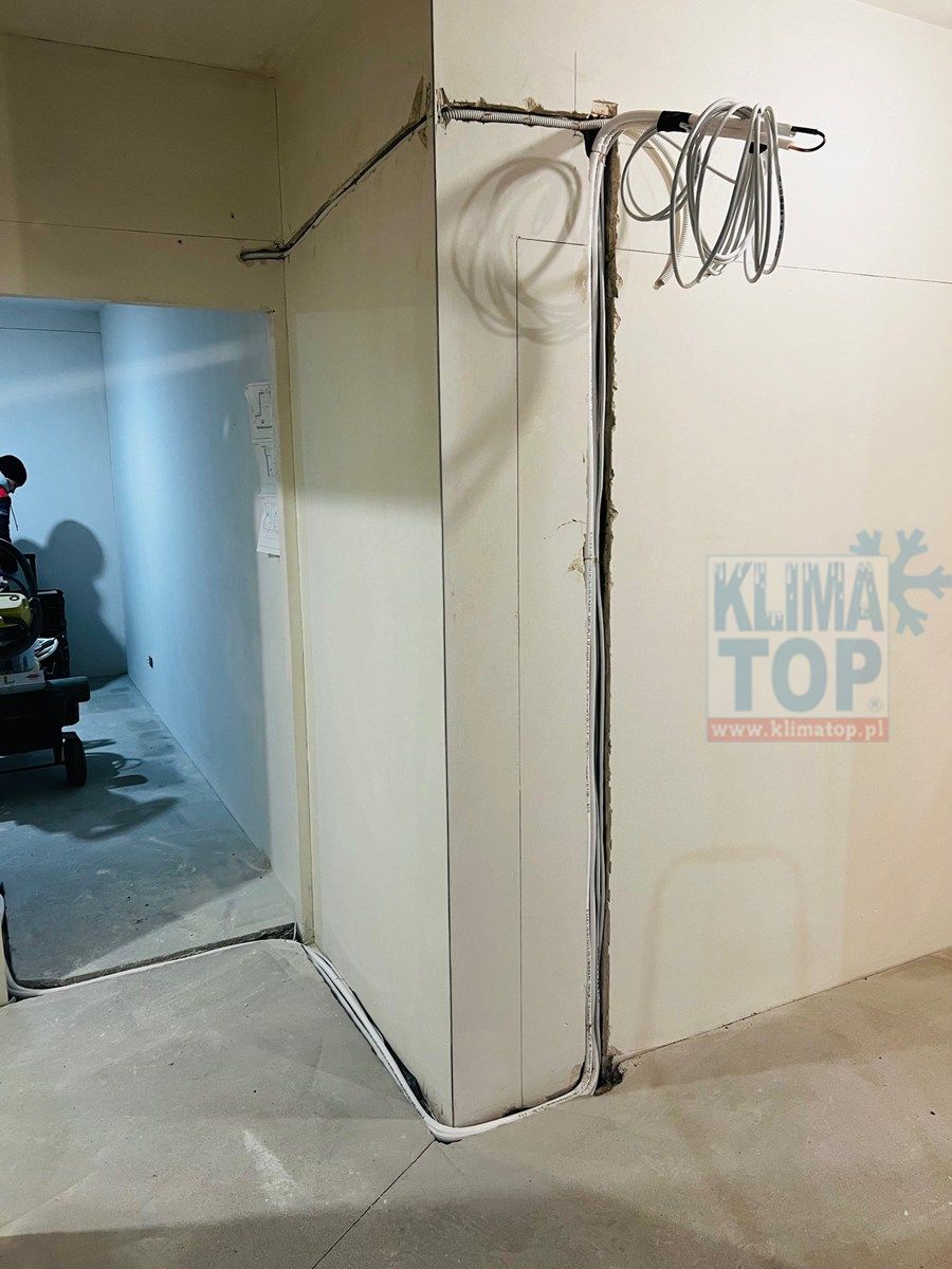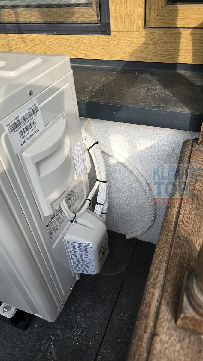 Jednostka wewnętrzna została zainstalowana na ścianie szczytowej, w nadprożu. Instalacja została przeprowadzona za "plecami" klimatyzatora na balkon (przewiert poza obrysem belki nadproża), gdzie została doprowadzona w górę i przeprowadzona w maskownicach na przeciwległy koniec balkonu celem jej sprowadzenia w dół i podłączenia do agregatu zewnętrznego posadowionego na posadzce. Skropliny zostały odprowadzone oddzielnie (rurka sprowadzona w miejscu wyprowadzenia instalacji chłodniczej na balkon) na balkon - woda będzie zbierana do zbiornika.