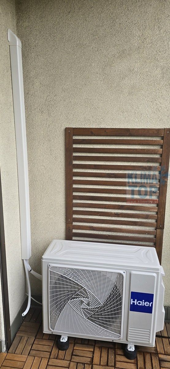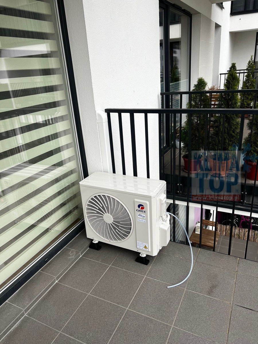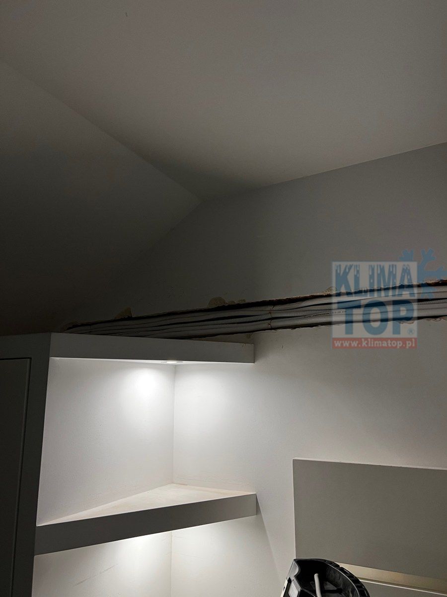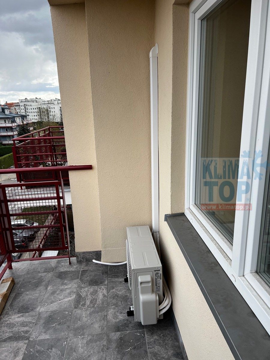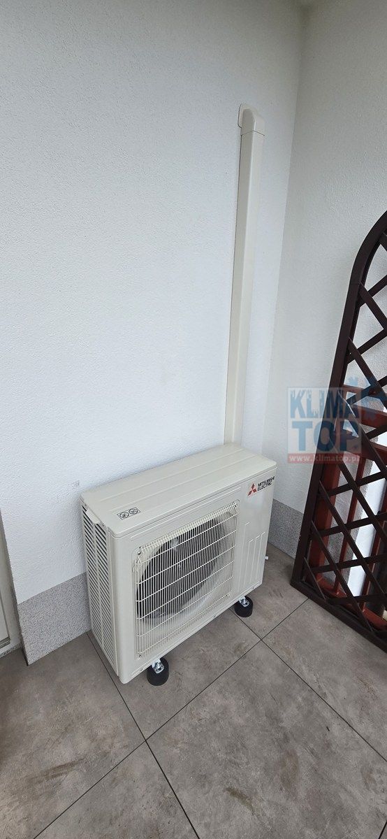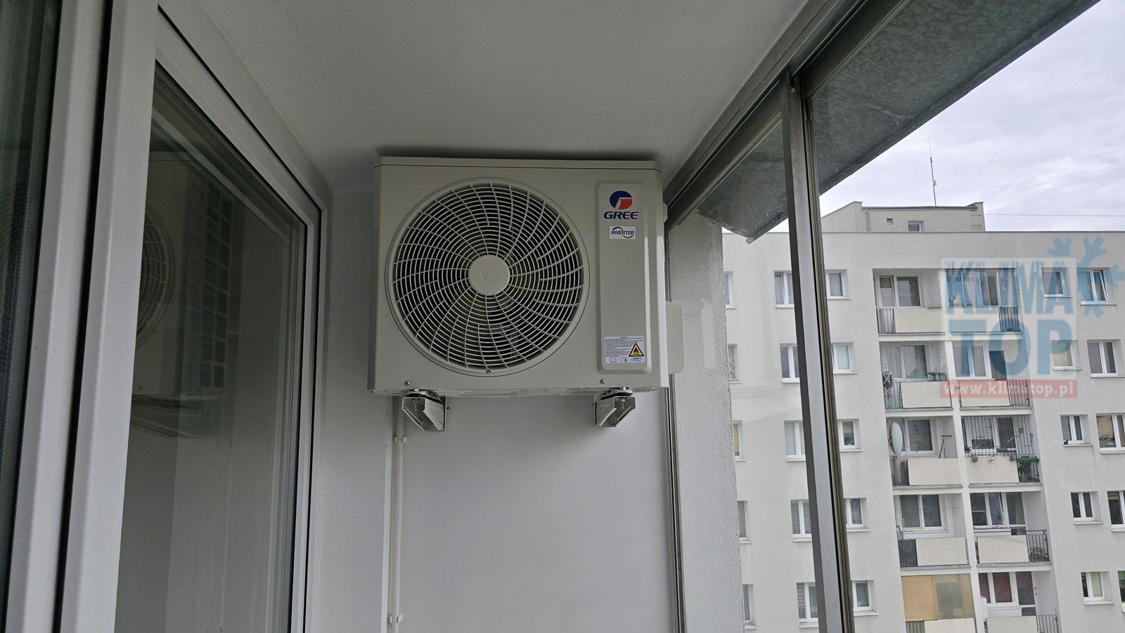 Jednostka wewnętrzna została zainstalowana na ścianie szczytowej, w nadprożu. Instalacja została przeprowadzona za "plecami" klimatyzatora na balkon (przewiert poza obrysem belki nadproża), gdzie została doprowadzona w górę i przeprowadzona w maskownicach na przeciwległy koniec balkonu celem jej sprowadzenia w dół i podłączenia do agregatu zewnętrznego posadowionego na posadzce. Skropliny zostały odprowadzone oddzielnie (rurka sprowadzona w miejscu wyprowadzenia instalacji chłodniczej na balkon) na balkon - woda będzie zbierana do zbiornika.