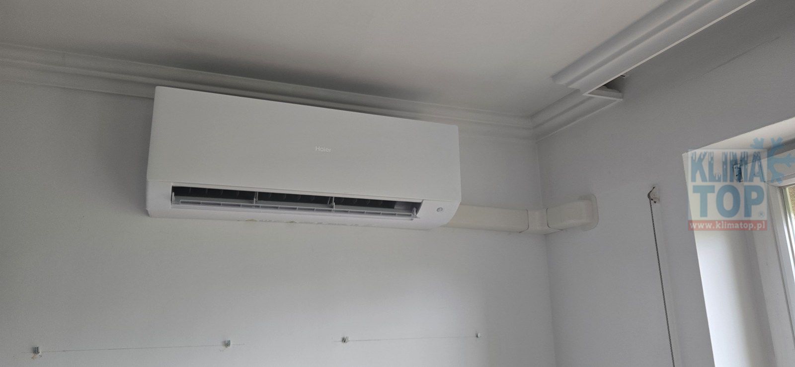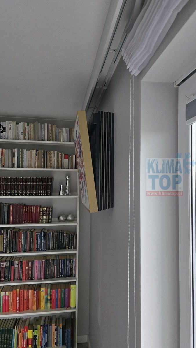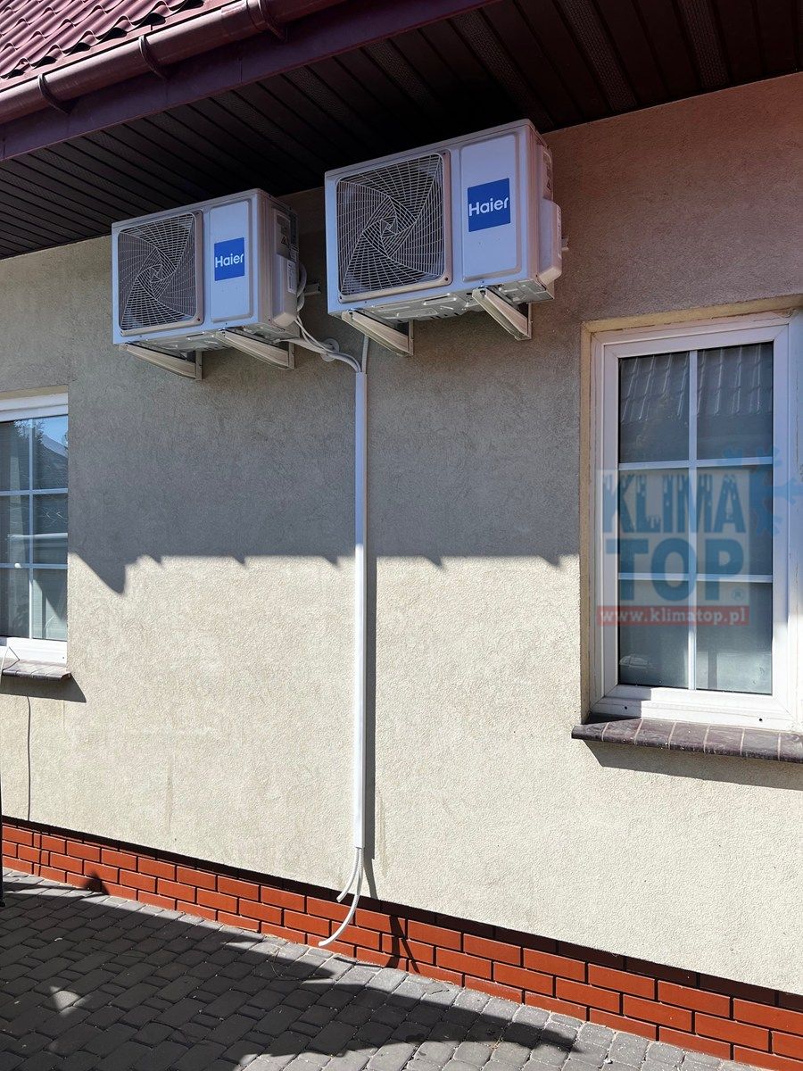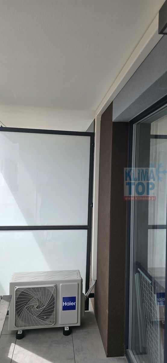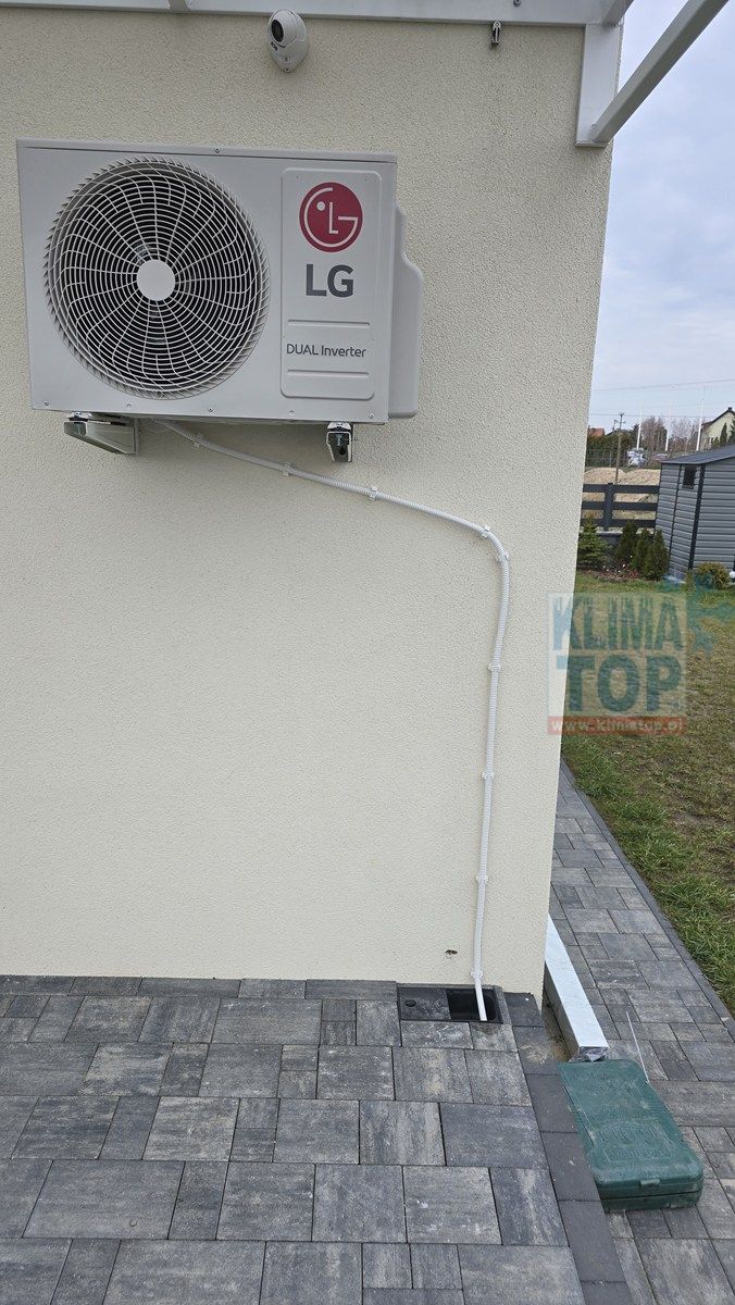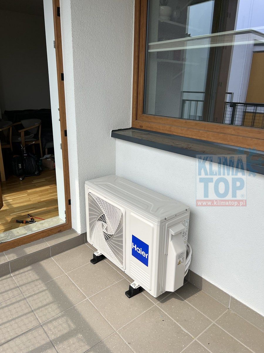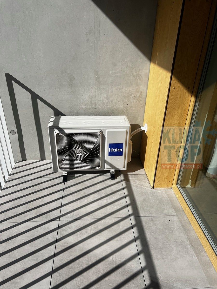 Jednostka wewnętrzna została zainstalowana na ścianie szczytowej, w nadprożu. Instalacja została przeprowadzona za "plecami" klimatyzatora na balkon (przewiert poza obrysem belki nadproża), gdzie została doprowadzona w górę i przeprowadzona w maskownicach na przeciwległy koniec balkonu celem jej sprowadzenia w dół i podłączenia do agregatu zewnętrznego posadowionego na posadzce. Skropliny zostały odprowadzone oddzielnie (rurka sprowadzona w miejscu wyprowadzenia instalacji chłodniczej na balkon) na balkon - woda będzie zbierana do zbiornika.