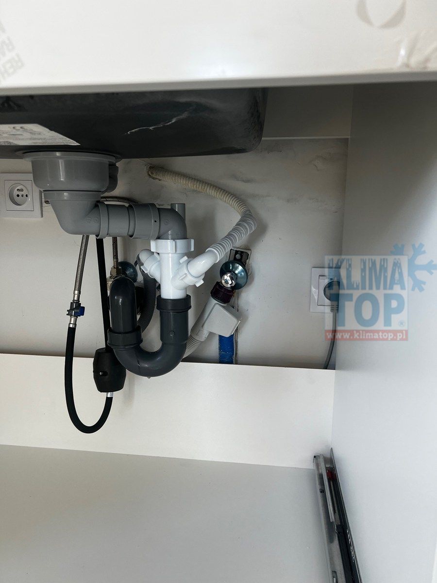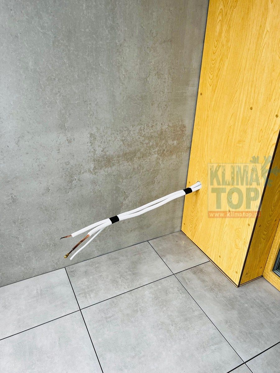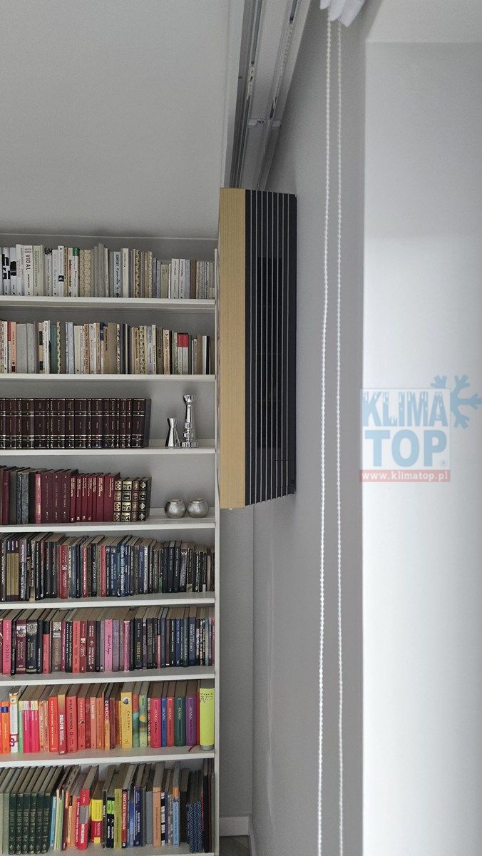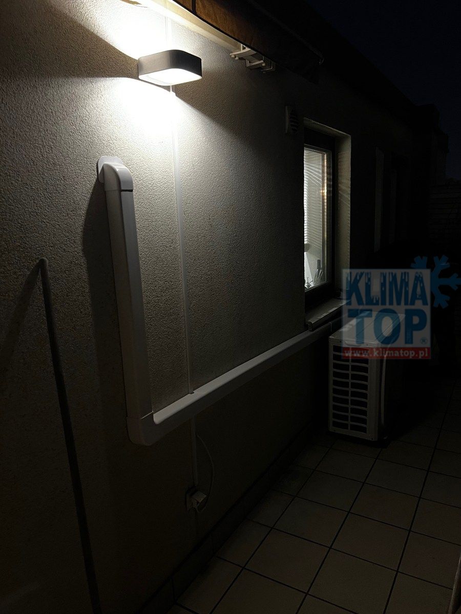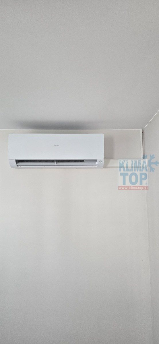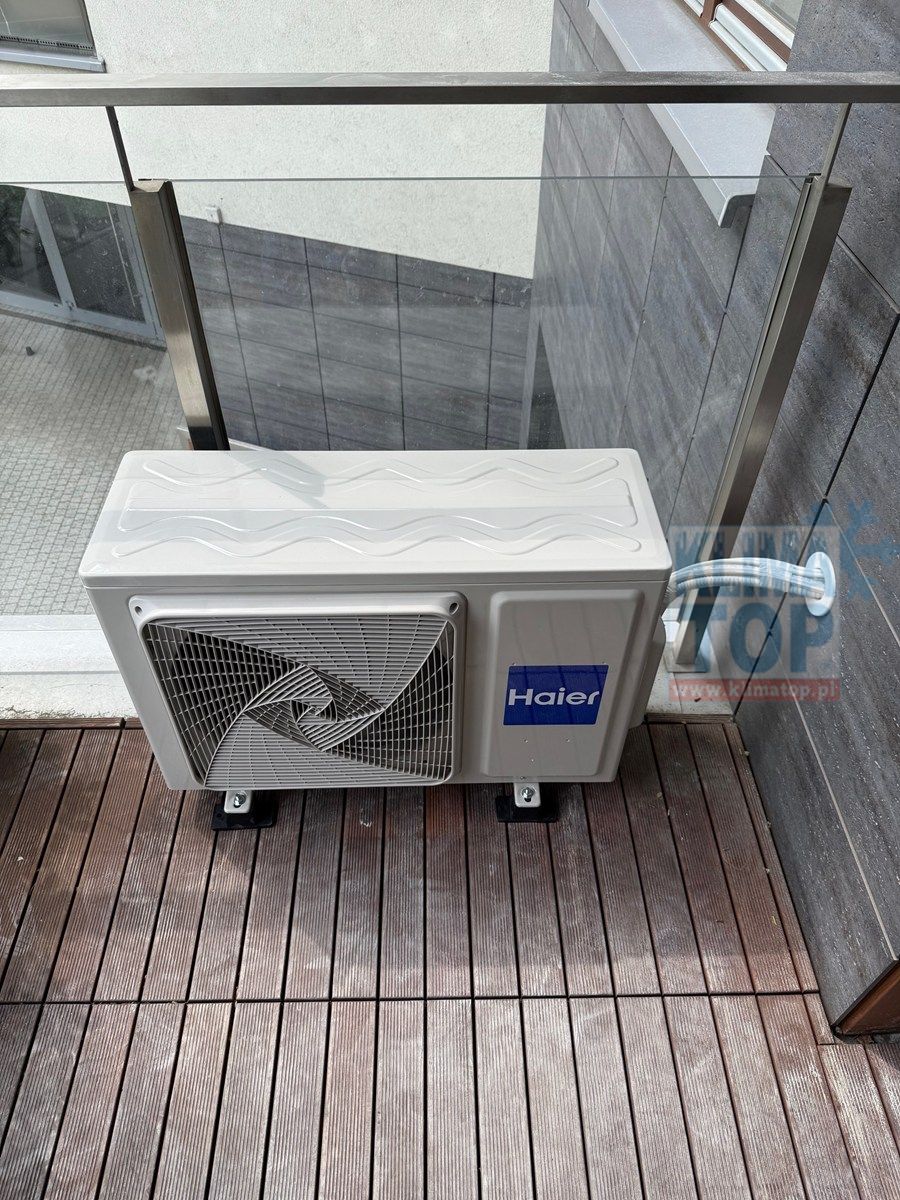 Jednostka wewnętrzna została zainstalowana na ścianie szczytowej, w nadprożu. Instalacja została przeprowadzona za "plecami" klimatyzatora na balkon (przewiert poza obrysem belki nadproża), gdzie została doprowadzona w górę i przeprowadzona w maskownicach na przeciwległy koniec balkonu celem jej sprowadzenia w dół i podłączenia do agregatu zewnętrznego posadowionego na posadzce. Skropliny zostały odprowadzone oddzielnie (rurka sprowadzona w miejscu wyprowadzenia instalacji chłodniczej na balkon) na balkon - woda będzie zbierana do zbiornika.