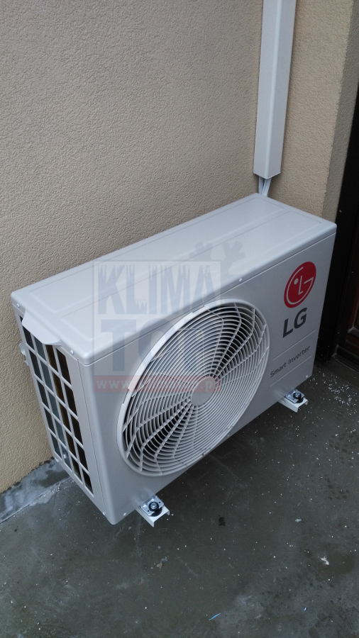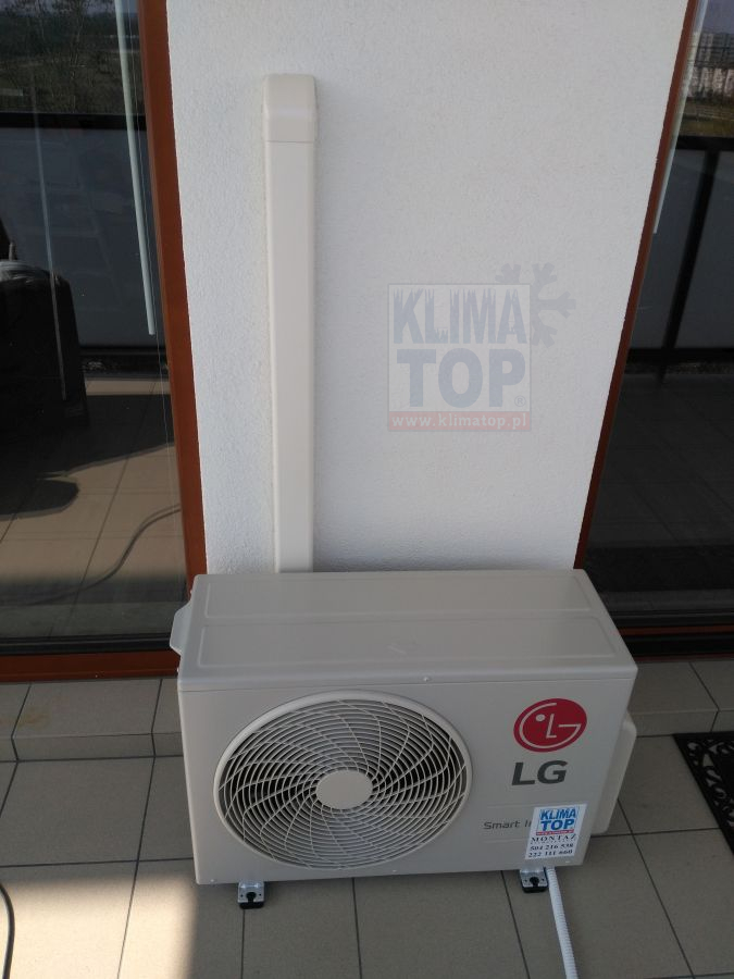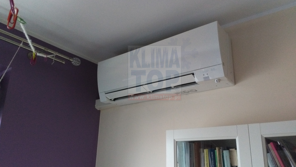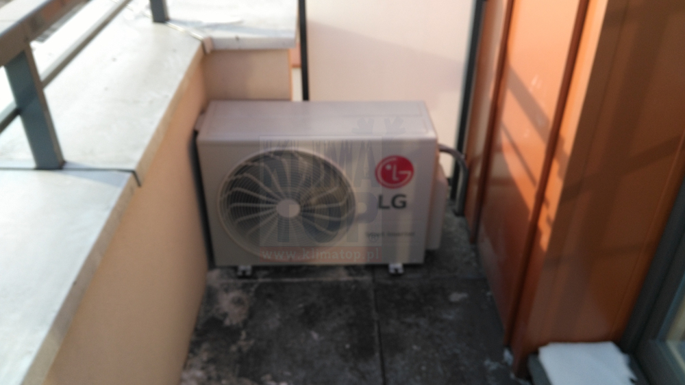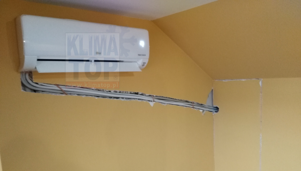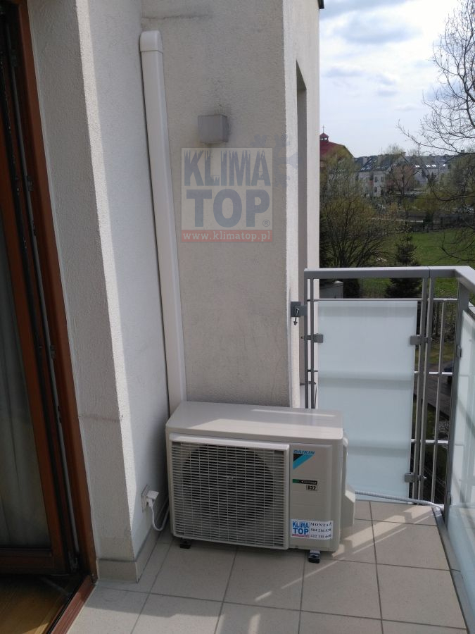 Jednostkę wewnętrzną zamontowano na ścianie szczytowej. Instalację wyprowadzono na zewnątrz pod "plecami" klimatyzatora, sprowadzono w maskownicy po elewacji balkonu i podłączono do agregatu stojącego na posadzce. Skropliny odprowadzono grawitacyjnie na zewnątrz razem z instalacją chłodniczą (woda będzie kapać na grunt).