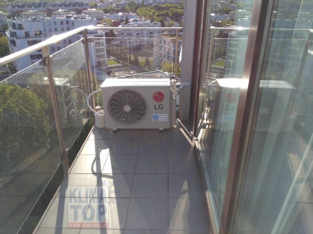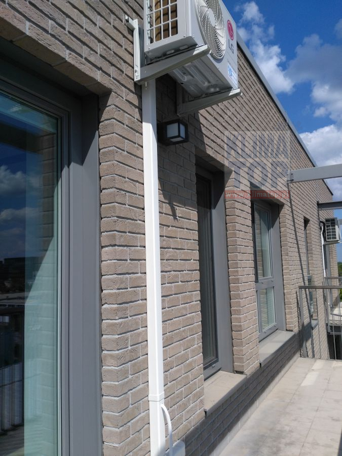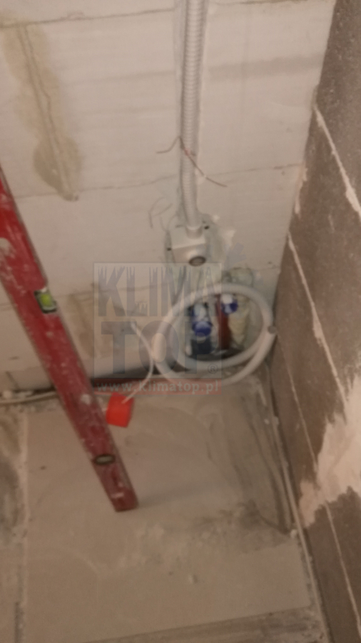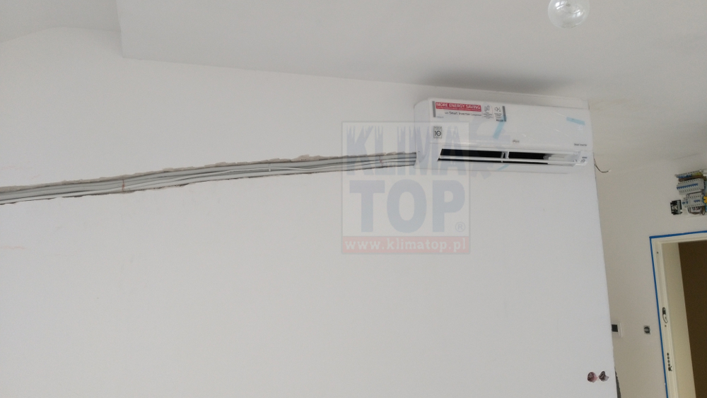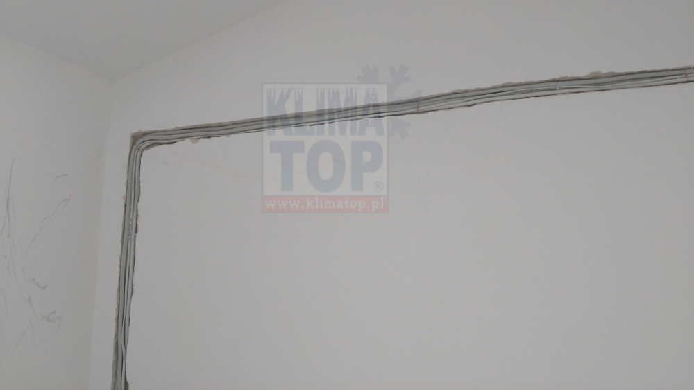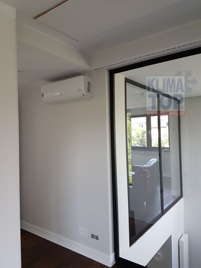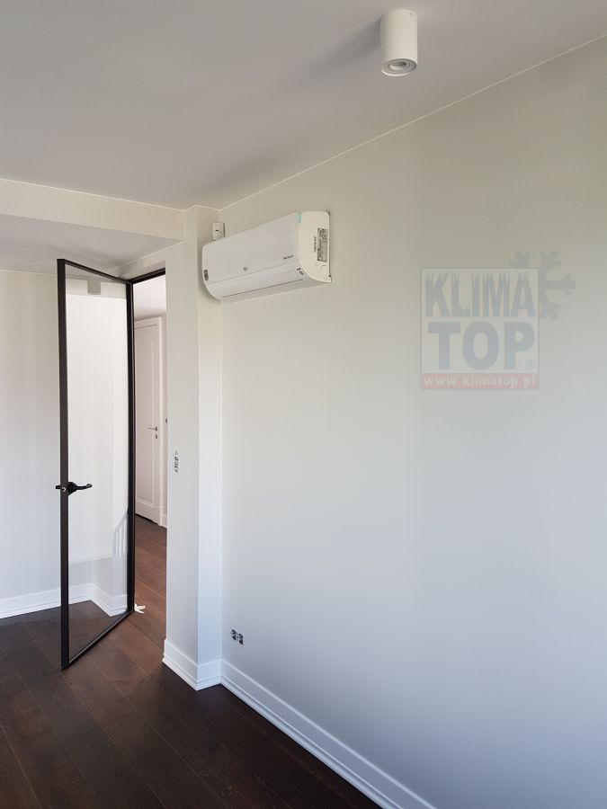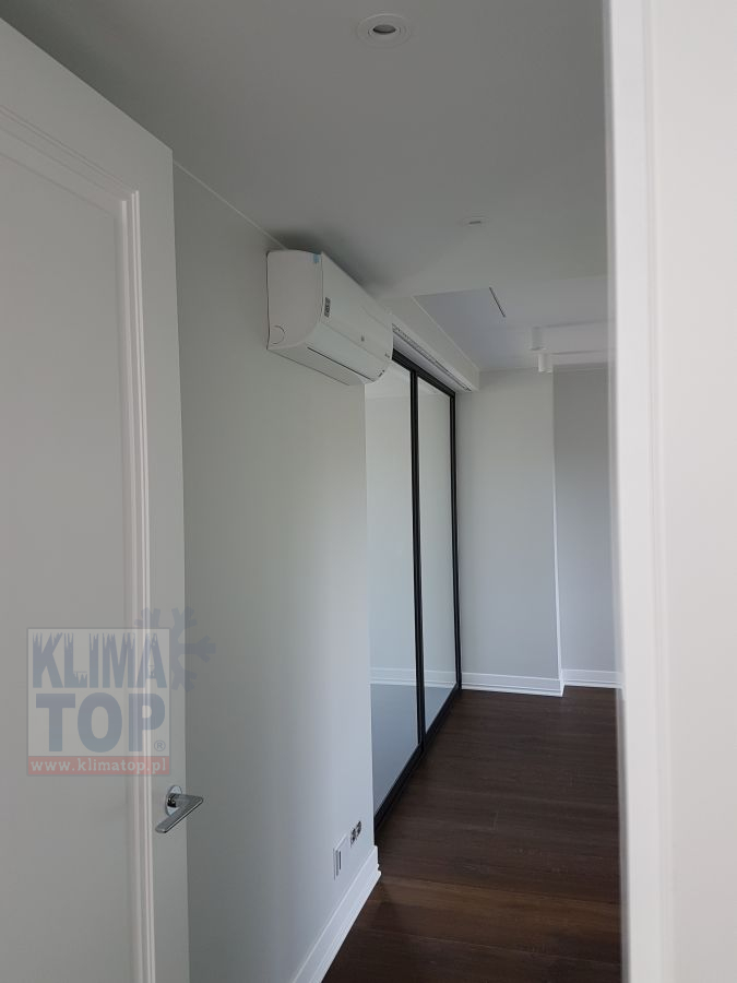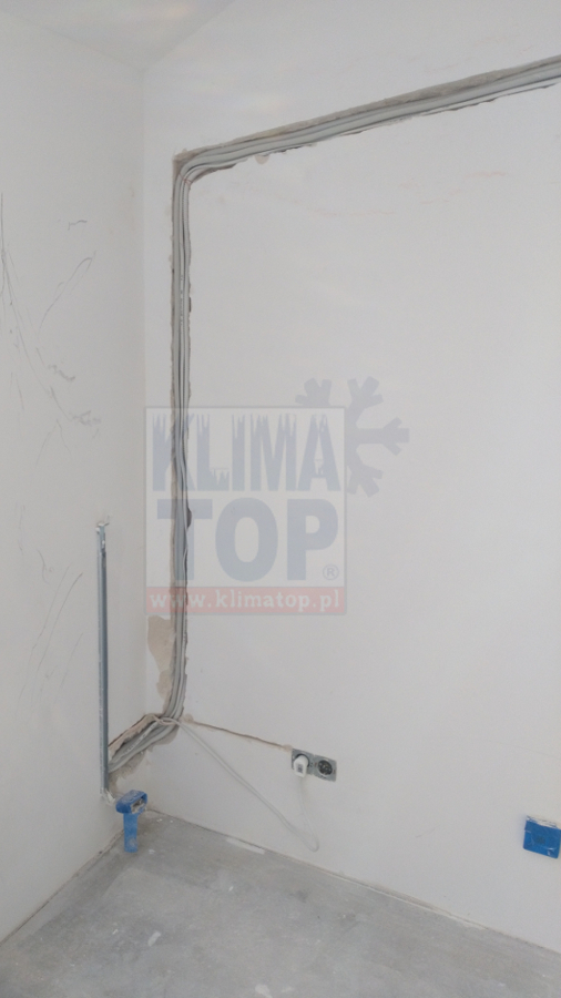 Jednostkę wewnętrzną zamontowano na ścianie szczytowej. Korzystając ze stanu developerskiego mieszkania, wykuto bruzdę w ścianie i poprowadzono w niej instalację. Dzięki takiemu rozwiązaniu po wykończeniu mieszkania na ścianie poza klimatyzatorem nie będzie żadnej instalacji. Skropliny odprowadzono grawitacyjnie na zewnątrz razem z instalacją chłodniczą (woda będzie odprowadzana przez odwodnienie tarasu).