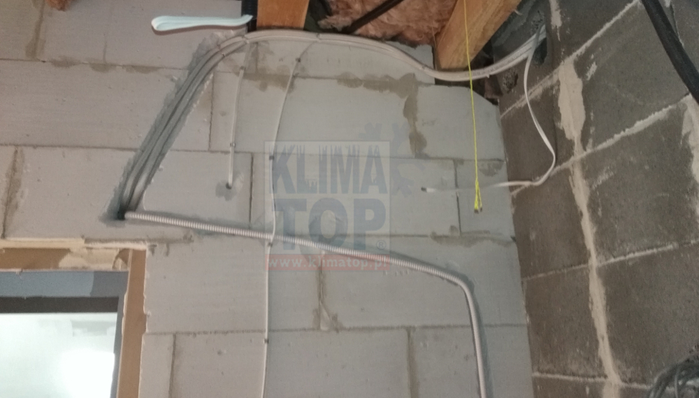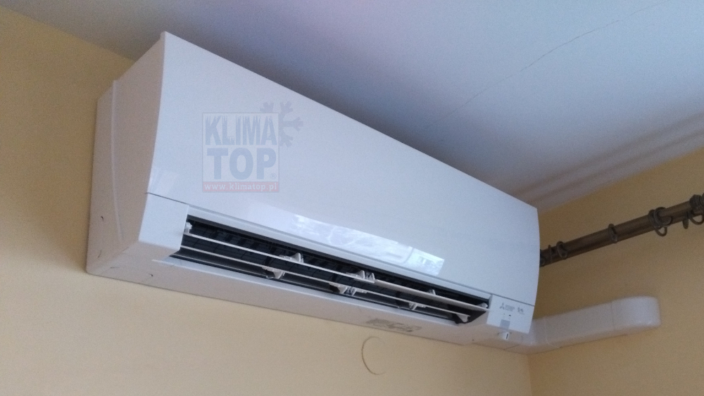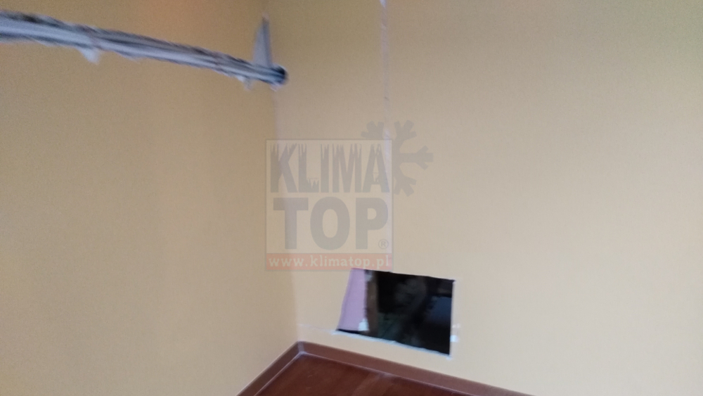 Jednostkę wewnętrzną zamontowano na ścianie prostopadłej do okien. Instalację w maskownicy doprowadzono do ściany szczytowej, wyprowadzono na zewnątrz i podłączono do agregatu stojącego na szerokim parapecie zewnętrznym. Skropliny odprowadzono grawitacyjnie na zewnątrz razem z instalacją chłodniczą (woda będzie swobodnie kapać na grunt).