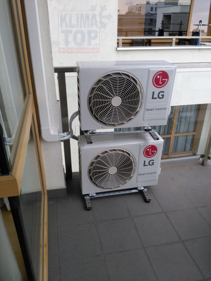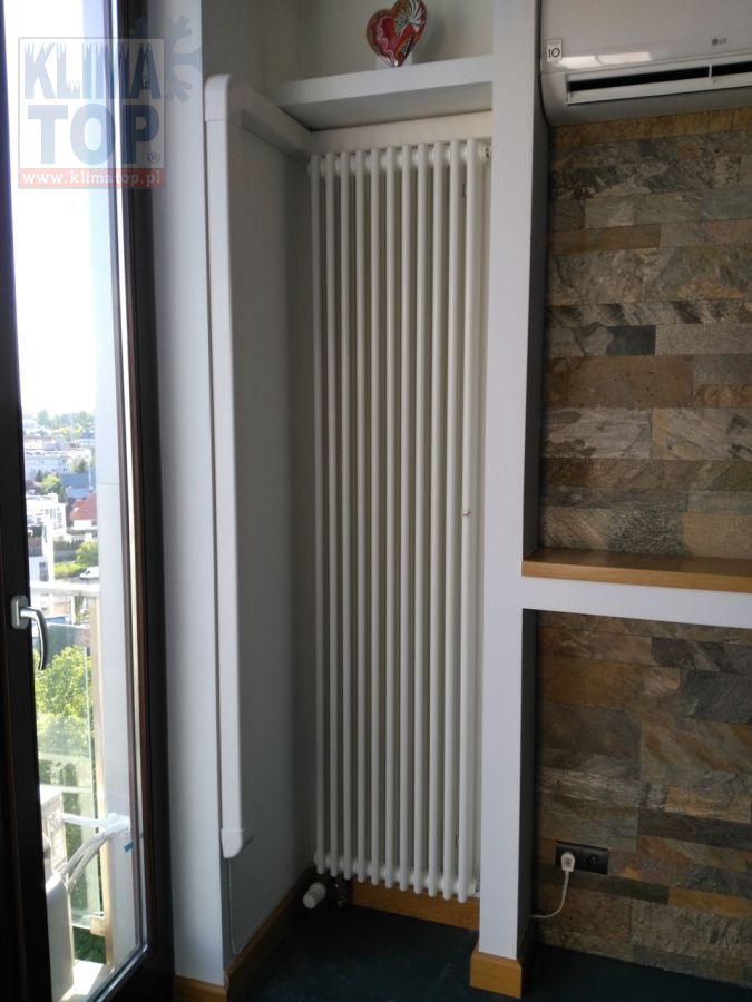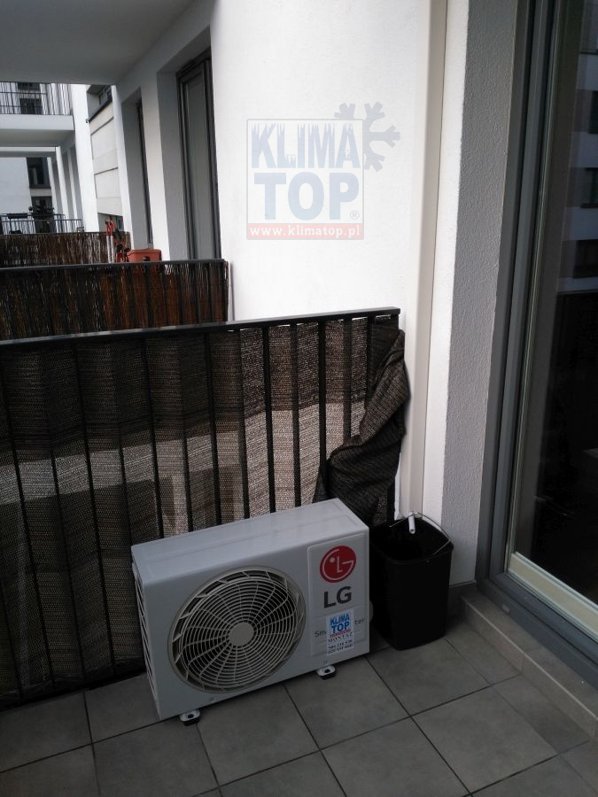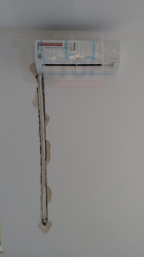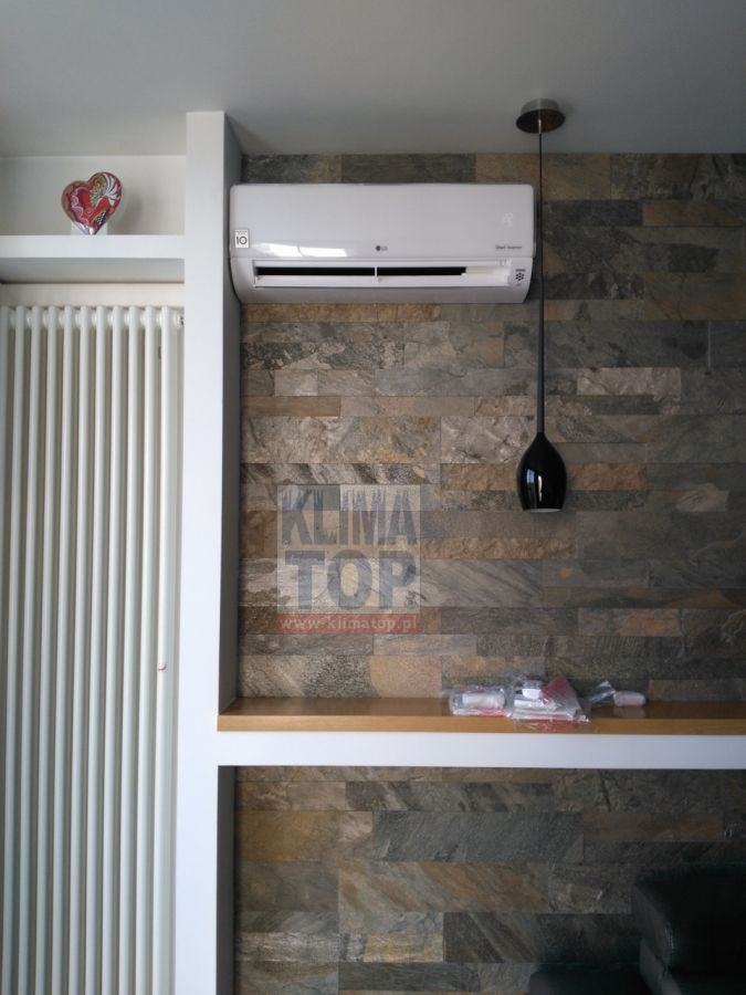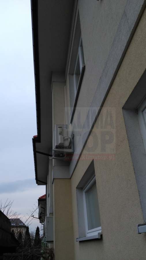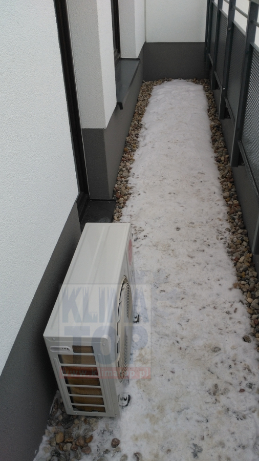 Jednostkę wewnętrzną zamontowano na ścianie z ozdobnym kamieniem. Korzystając z oddzielenia półścianką grzejnika, przeprowadzono instalację na jego stronę a następnie w maskownicy doprowadzono instalację do ściany szczytowej, wyprowadzono na zewnątrz i podłączono do agregatu stojącego na posadzce balkonu. Skropliny odprowadzono grawitacyjnie na zewnątrz razem z instalacją chłodniczą (woda będzie zbierana do zbiornika).