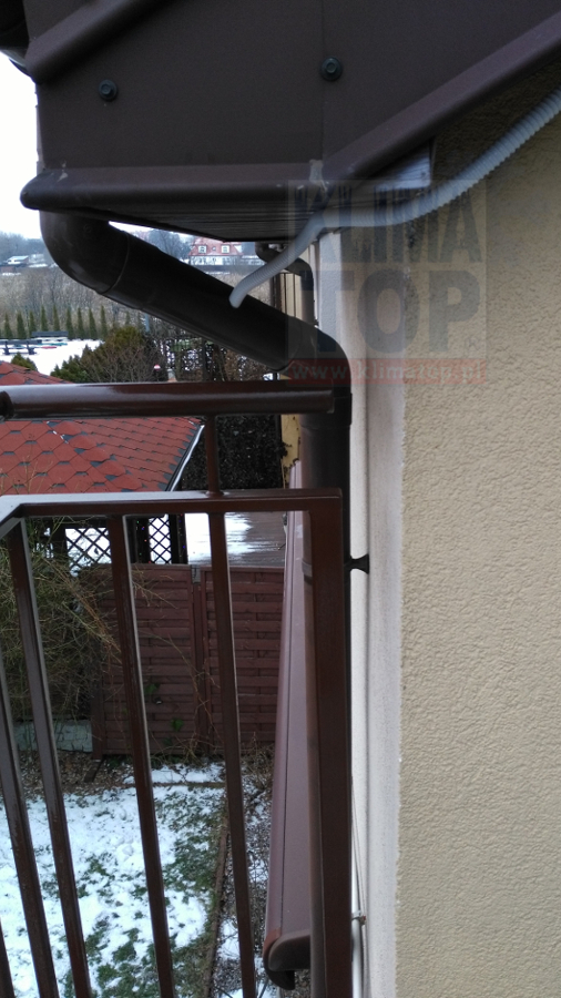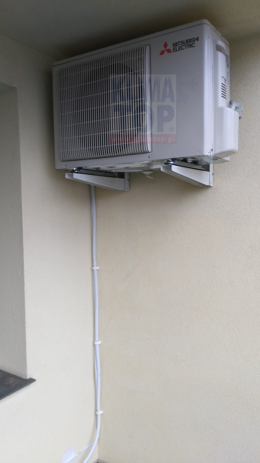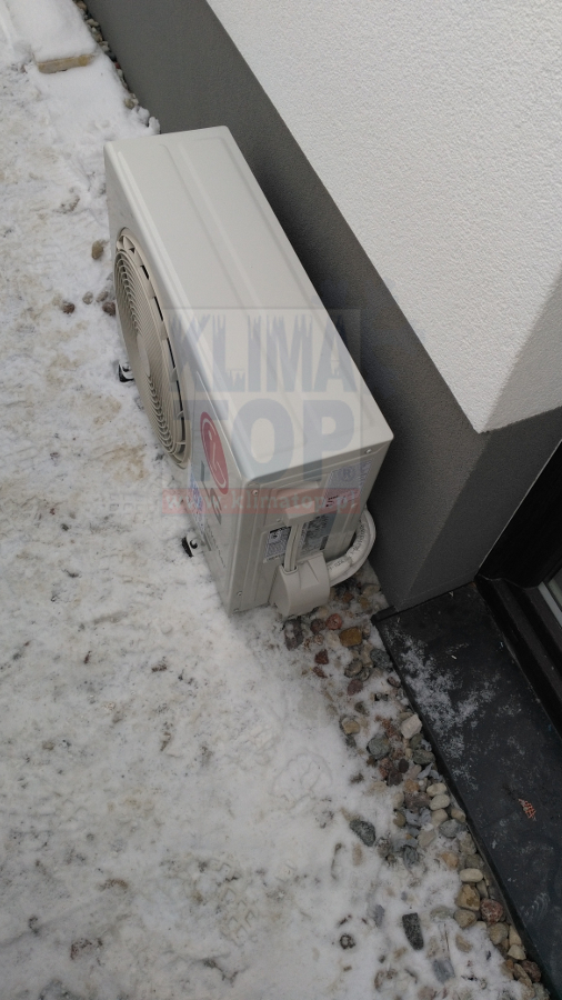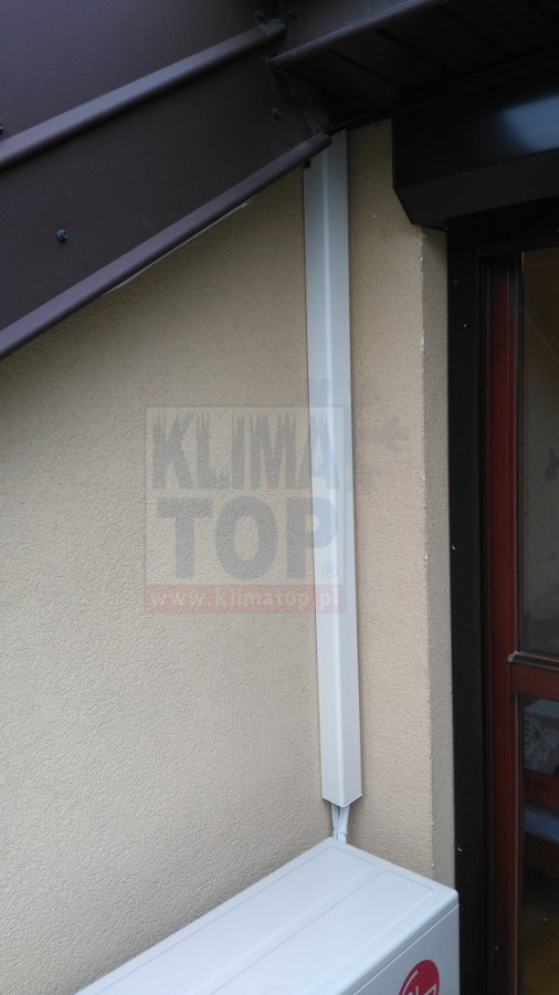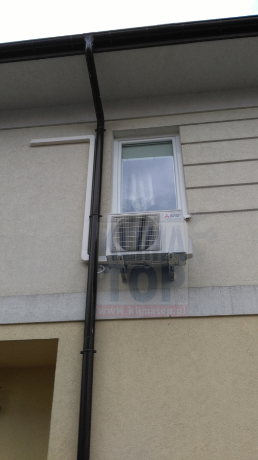 Jednostkę wewnętrzną zamontowano na ścianie szczytowej. Instalację wyprowadzono na zewnątrz pod "plecami" klimatyzatora, sprowadzono po elewacji w maskownicy do agregatu stojącego na posadzce balkonu. Skropliny odprowadzono grawitacyjnie na zewnątrz razem z instalacją chłodniczą (woda będzie zbierana do zbiornika).