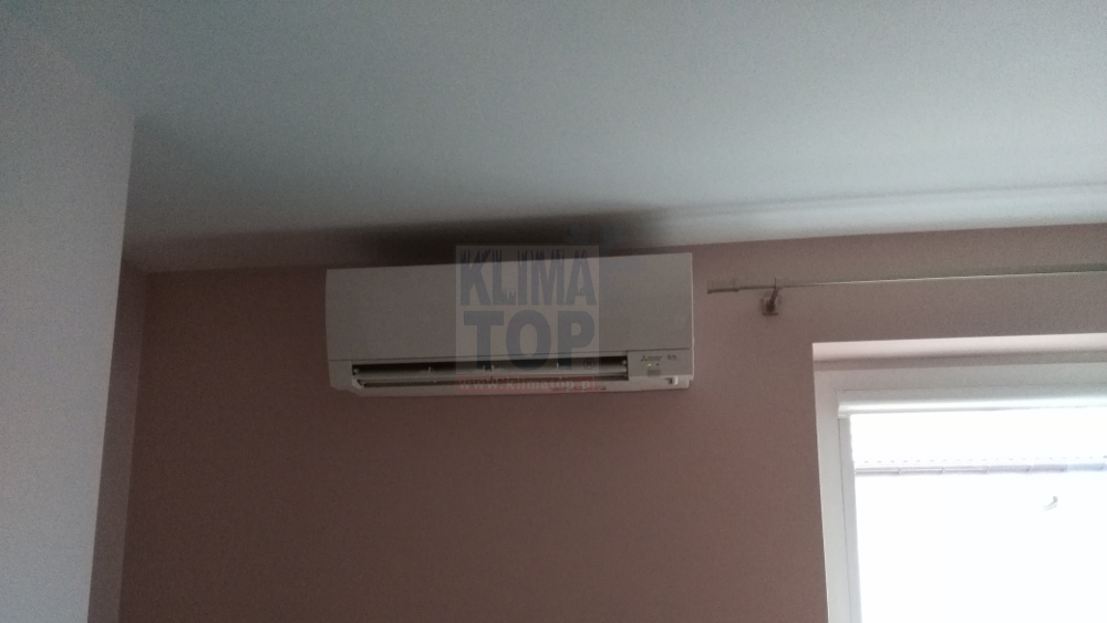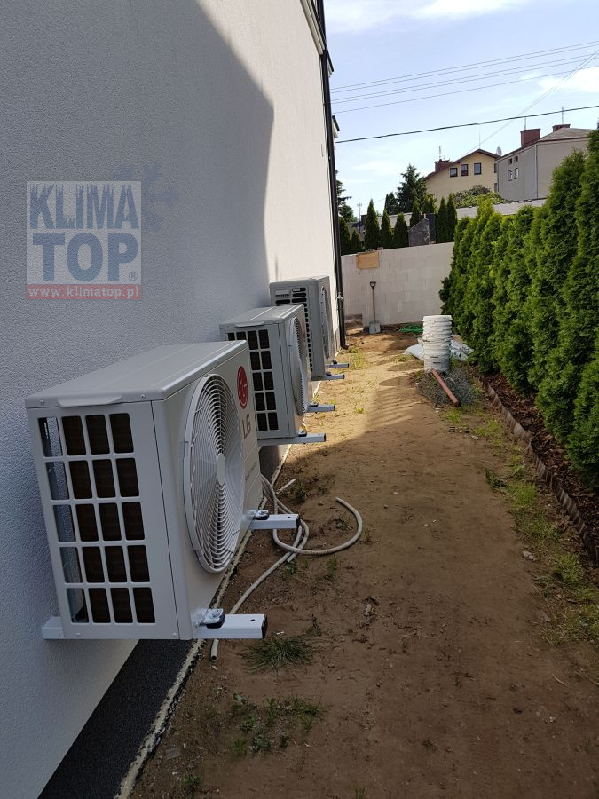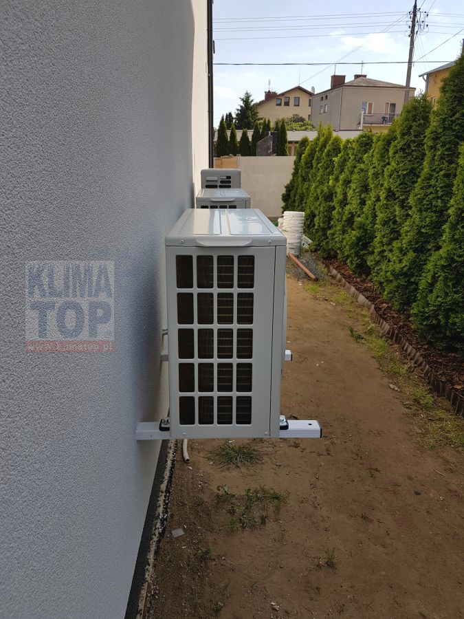 Jedną jednostkę wewnętrzną zamontowano na ścianie szczytowej. Instalację przeprowadzono na zewnątrz pod "plecami" klimatyzatora, a instalację poprowadzono w maskownicach po elewacji budynku i podłączono do agregatu podwieszonego do ściany pod oknem. Drugą zamontowano na ścianie prostopadłej do okien a agregat także powieszono na elewacji. Skropliny w obu przypadkach wyprowadzono grawitacyjnie na zewnątrz.