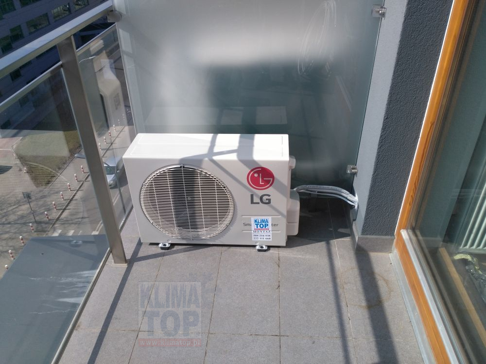 Jednostkę wewnętrzną zamontowano na ścianie pokoju i w nim poprowadzono instalację w bruździe wykutej w ścianie. Na balkonie instalację poprowadzono w maskownicy. Skropliny odprowadzono grawitacyjnie na zewnątrz razem z instalacją chłodniczą (wodę odprowadzono do rynny). Agregat podwieszono na konstrukcji mocowanej do elewacji balkonu