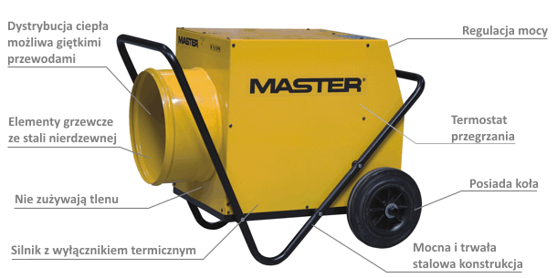 Nagrzewnica Master doskonale nadaje się do ogrzewania awaryjnego, jest łatwa w obsłudze i w pełni przenośna. Nagrzewnica elektryczna firmy Master wykonana jest z najwyższej klasy komponentów z odpowiednimi certyfikatami, zapewniając tym samym wysoką wydajność i niezawodność.