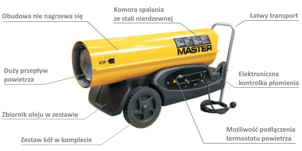 Ceniona na rynku firma Master znana jest z produkcji wydajnych oraz jednocześnie oszczędnych nagrzewnic olejowych. Dostępny w naszej ofercie model B 130 osiąga moc grzewczą na poziomie aż 31 kW i zużywa zaledwie około 3 litrów oleju (napędowego lub opałowego) na godzinę. W celu dokładnego zapoznania się z jego specyfikacją oraz złożenia zamówienia zapraszamy do kontaktu z naszym doradcą.