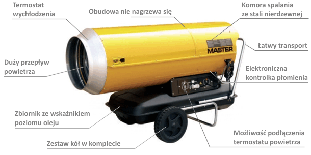 Nagrzewnice olejowe bez odprowadzenia spalin to wysoce wydajne urządzenia zapewniające stały dopływ dużych ilości ogrzanego powietrza tam, gdzie jest ono pożądane. Doskonale nadają się do otwartych lub dobrze wentylowanych powierzchni, takich jak fabryki, magazyny lub na tereny budów. Nagrzewnice bez odprowadzenia spalin firmy Master są zarówno wydajne, trwałe, jak i bezpieczne i proste w obsłudze.
