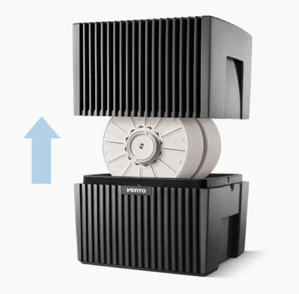Model Venta LW15 Comfort Plus wykorzystuje sprawdzoną technologię ewaporacji, opartą na obrotowych dyskach VentWave 3D. Powietrze przepływające przez urządzenie zostaje naturalnie nawilżone, a większe cząsteczki zanieczyszczeń, takie jak kurz czy pyłki, wiązane są w wodzie. Dzięki temu urządzenie działa jednocześnie jako nawilżacz powietrza i prosty oczyszczacz powietrza, poprawiając mikroklimat w pomieszczeniu. Co ważne, system nie wymaga stosowania wymiennych filtrów – wystarczy czysta woda z kranu. To rozwiązanie nie tylko ekonomiczne, ale także higieniczne i wygodne w codziennym użytkowaniu.