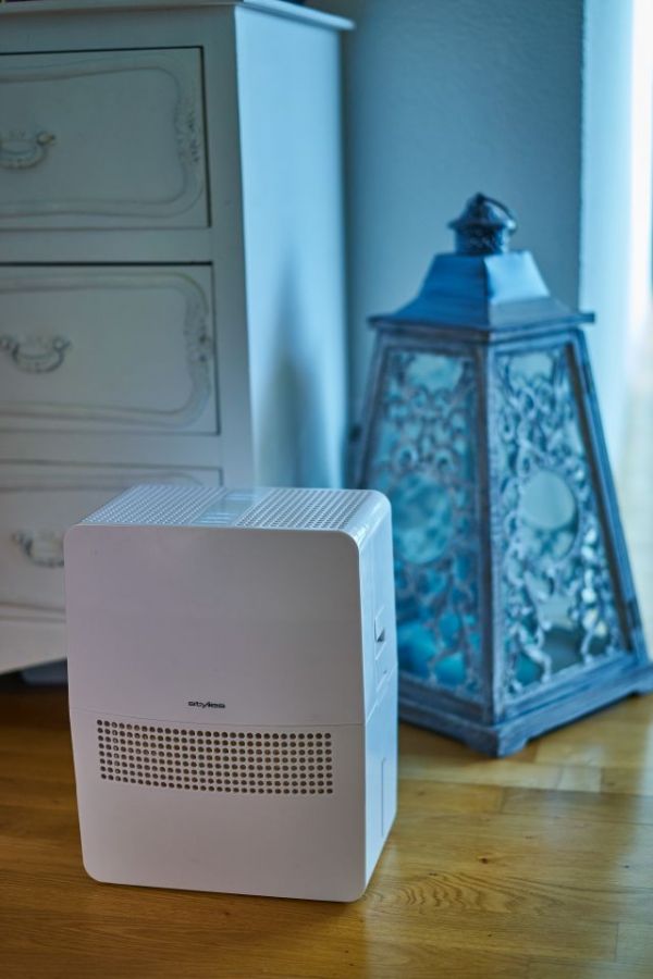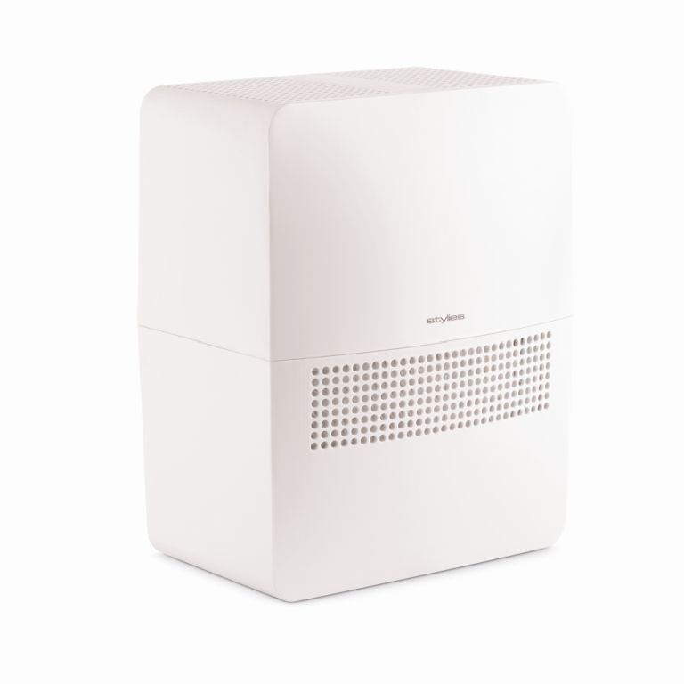Nawilżacz ewaporacyjny Helos francuskiej marki Stylies z filtrem antybakteryjnym, zabezpieczeniem przed namnażaniem się mikroorganizmów (system Clean Cube), szufladką na olejki zapachowe oraz zintegrowanym higrostatem. Doskonały do sypialni i pokoju dziecięcego.