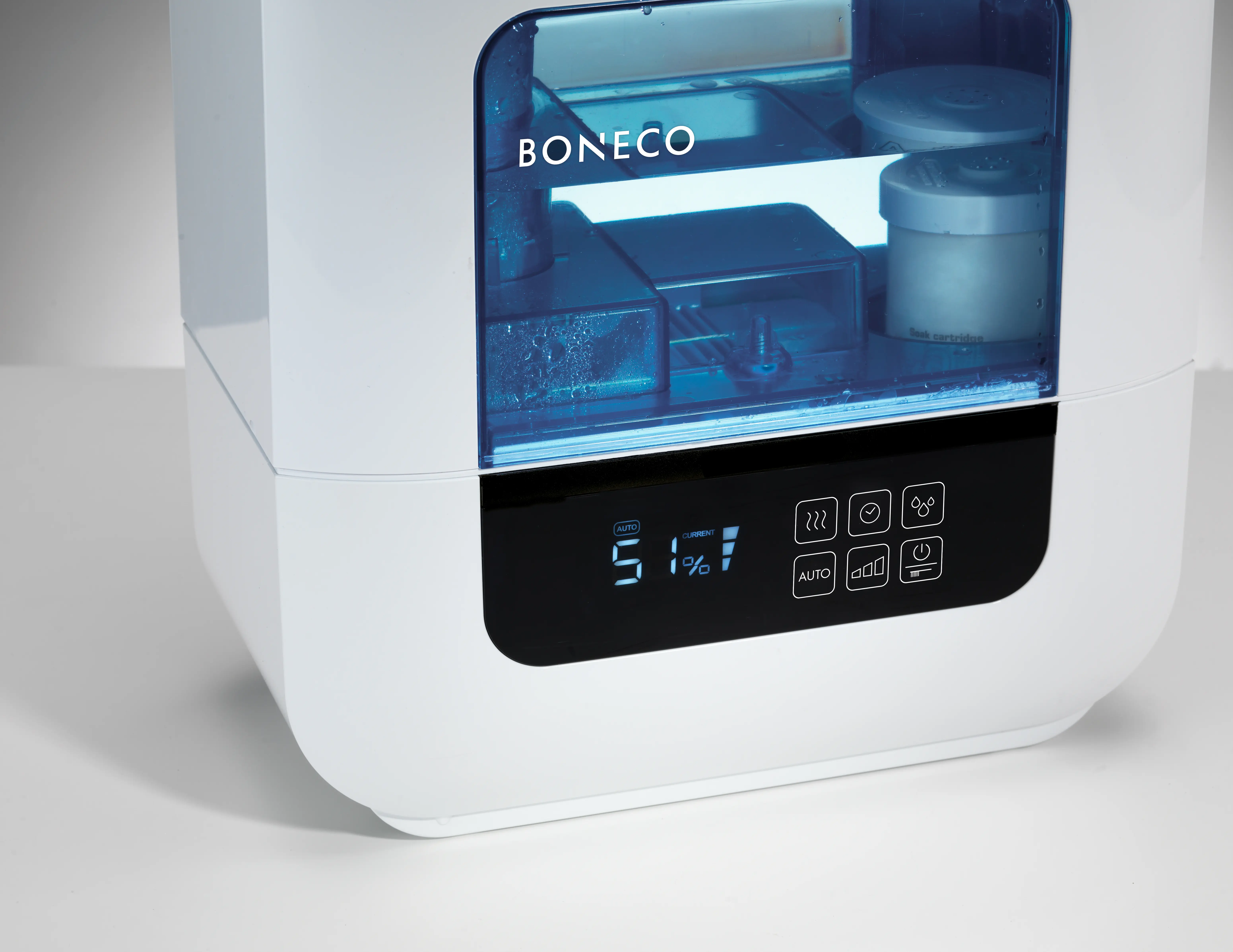 Nawilżacz powietrza Boneco U700 wyposażony jest w cyfrowy panel sterowania z funkcją ściemniania, co umożliwia wygodne monitorowanie i dostosowywanie ustawień. Funkcja AUTO MODE automatycznie dostosowuje poziom nawilżenia do aktualnych warunków w pomieszczeniu. Dodatkowo, urządzenie posiada timer, funkcję przypomnienia o konieczności czyszczenia oraz możliwość używania olejków eterycznych dzięki wbudowanemu pojemnikowi na zapachy.