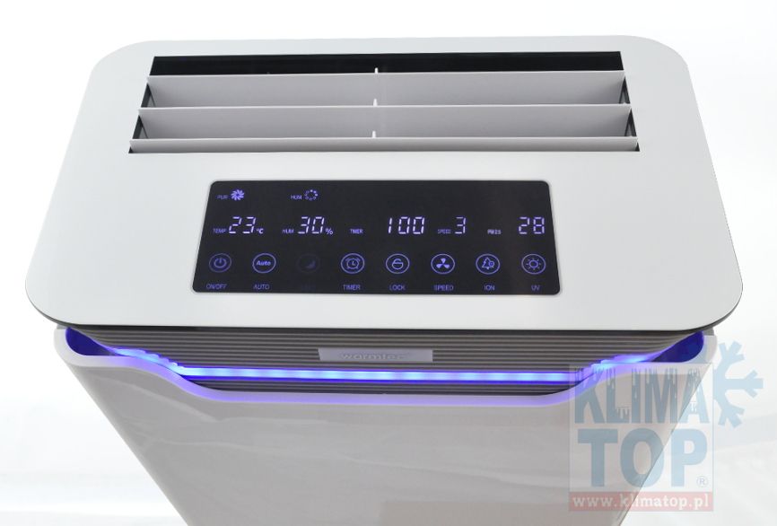 Oczyszczacz Warmtec wyposażono w dotykowy panel sterujący, 4 stopniową pracę wentylatora, oraz liczbowy wskaźnik jakości powietrza (mikrogramy/m3) informujący o zawartości w nim PM2,5 (smogu). Oczyszczacz dodatkowo posiada timer pozwalający na ustawienie urządzenia tak aby pracowało przez zadany okres czasu (1,2,4,8 lub 12h).