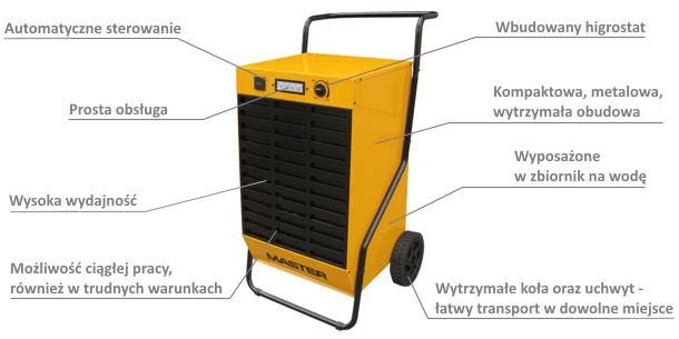 Do sterowania tego modelu osuszacza przewidziano higrostat (skala 20-80%) załączający odwilżacz w przypadku przekroczenia zadanej wartości. Stan przepracowanych godzin widoczny jest na liczniku umieszczonym na frontowym panelu sterowania.