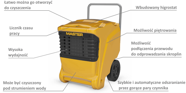 Osuszacz firmy Master może być sterowany wbudowanym higrostatem lub, po podpięciu do specjalnego gniazda - higrostatem zewnętrznym. Ponadto, łatwe utrzymanie urządzenia w czystości oraz zamontowany licznik czasu pracy sprawiają, że przemysłowy osuszacz powietrza Master DHP 65 się sprawdzi się w wypożyczalniach sprzętu specjalistycznego.