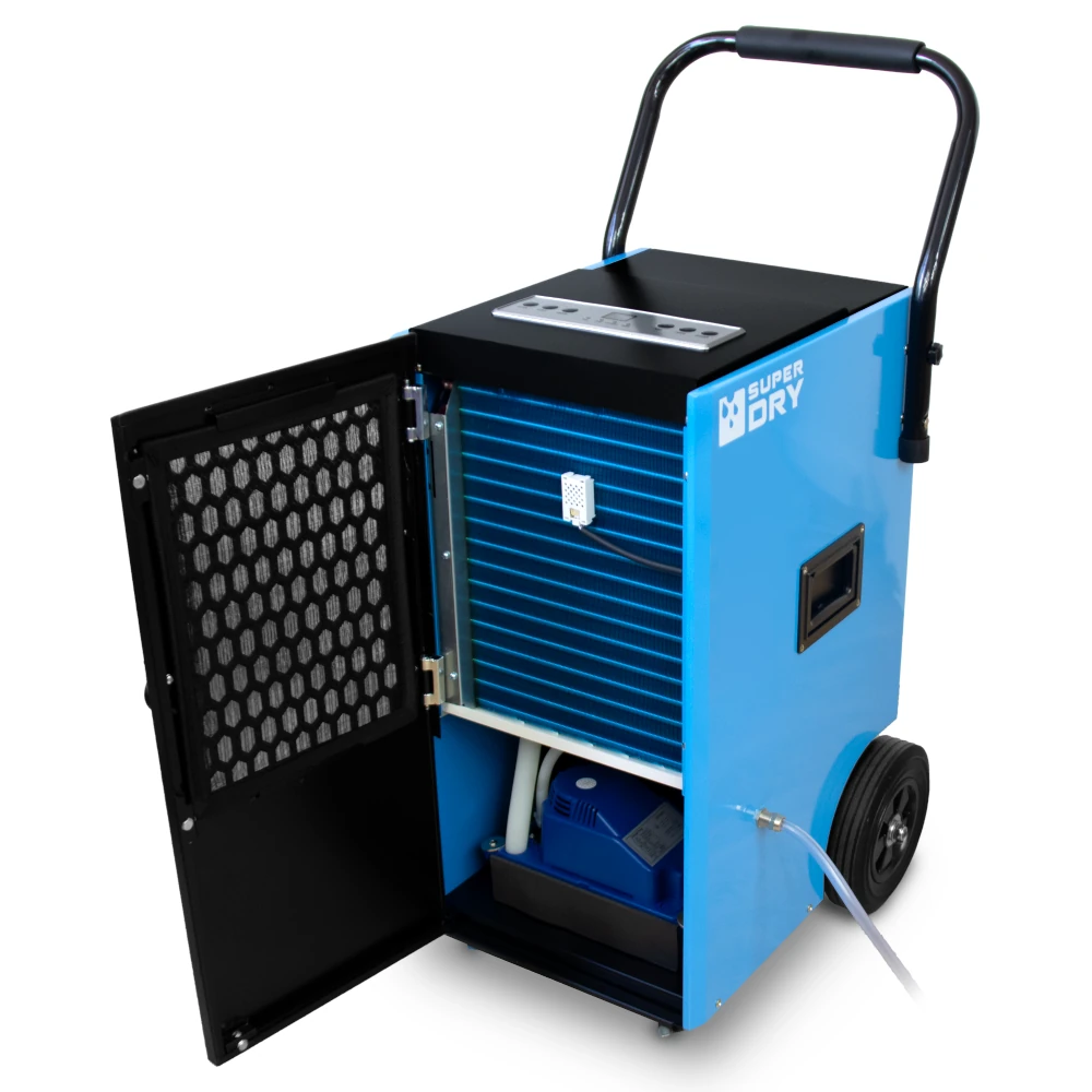 Super Dry FDSD70 to wysokowydajny kondensacyjny osuszacz powietrza przeznaczony do intensywnej pracy w warunkach przemysłowych i budowlanych. Dzięki większej mocy i zastosowaniu nowoczesnych rozwiązań technologicznych, takich jak pompa skroplin i system odszraniania gorącym gazem, FDSD70 doskonale sprawdzi się podczas osuszania dużych powierzchni - hal, magazynów, piwnic, garaży oraz obiektów w trakcie lub po remoncie.
