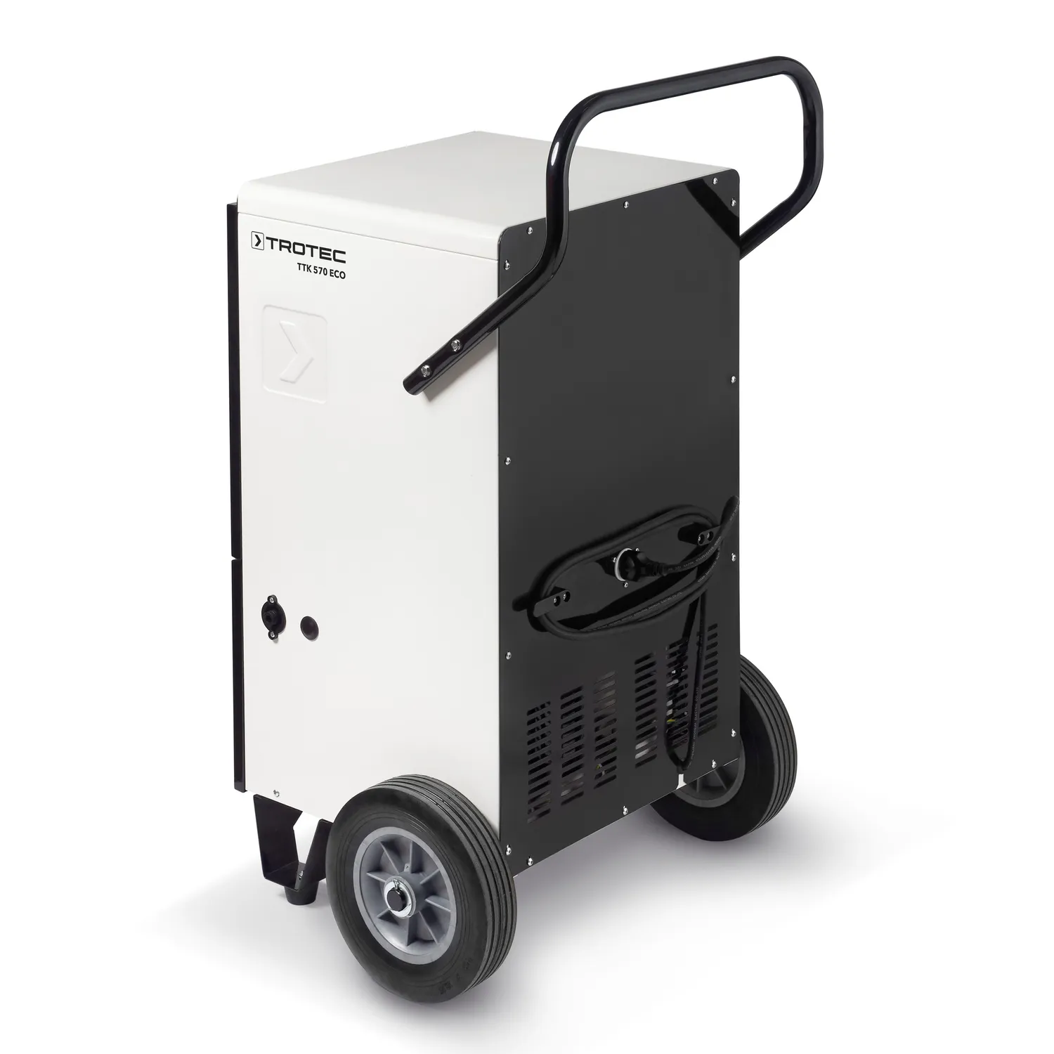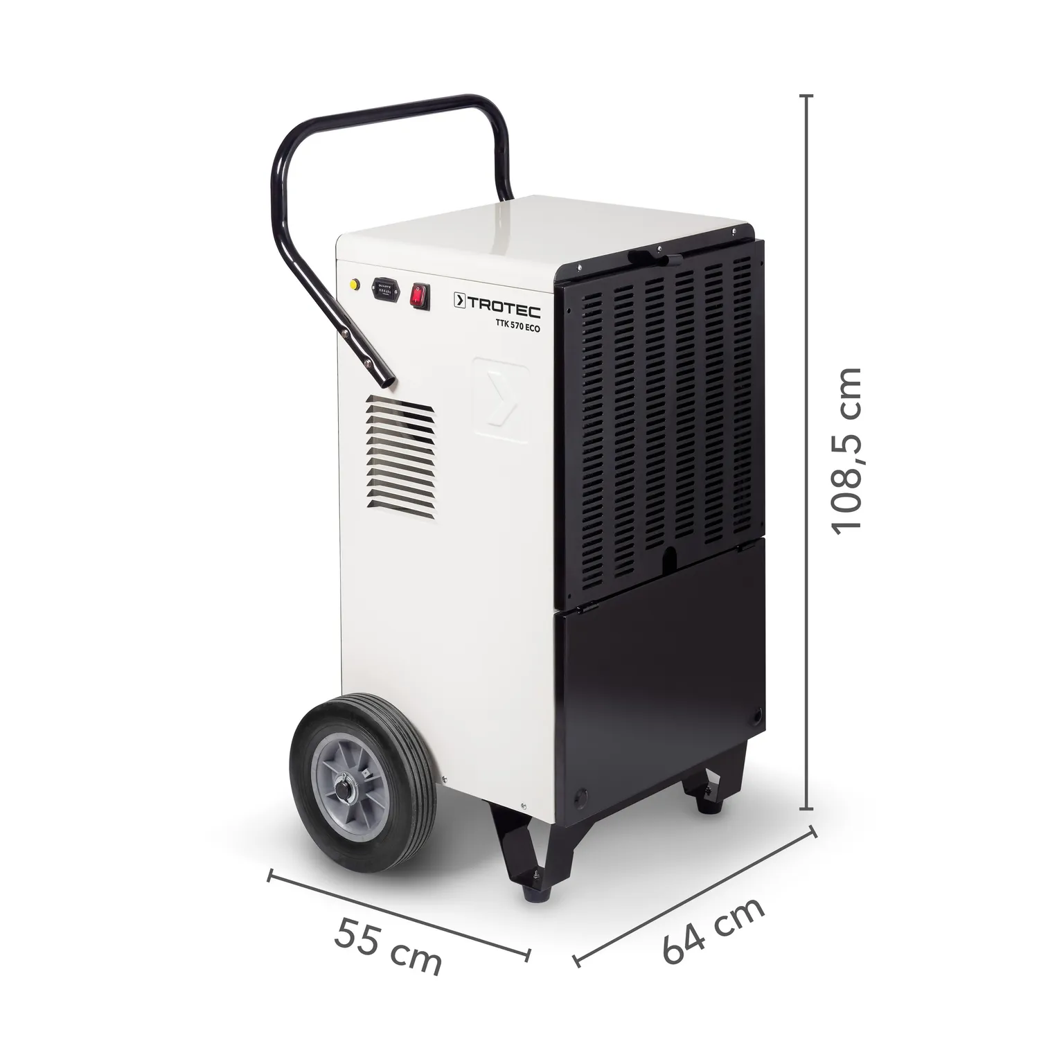 Model TTK 570 Eco to również budowlany osuszacz powietrza, który dzięki wytrzymałej stalowej obudowie i przemyślanej konstrukcji w wersji wózkowej świetnie sprawdza się w trudnych warunkach wymagających mobilności. Duże, gumowane koła transportowe oraz ergonomiczny uchwyt usprawniają przewożenie urządzenia między kolejnymi pomieszczeniami, co ma szczególne znaczenie przy zadaniach osuszania po zalaniach czy w trakcie remontu. Solidna obudowa odporna na uszkodzenia mechaniczne i warunki pracy na zewnątrz gwarantują długotrwałe użytkowanie w wymagających środowiskach.