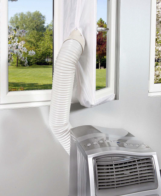 Tekstylna, biała uszczelka z błyskawicznym zamkiem, mocowana na oknie za pomocą taśmy na rzepy, pozwala efektywnie korzystać z właściwości mobilnego klimatyzatora.