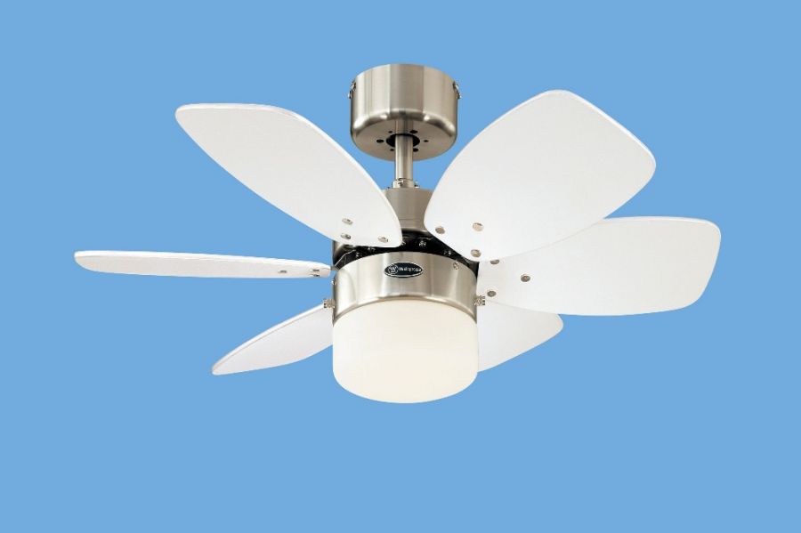 Nowoczesny, kwiecisty wygląd: sześć dwustronnych łopat w kształcie kwiatów koloru białego lub srebrnego, satynowo chromowe powierzchnie obudowy, oraz pojedyncza lampa z matowym szkłem sprawiają, że ten model wentylatora marki Westinghouse jest niewątpliwie mile widzianym sprzętem domowym.