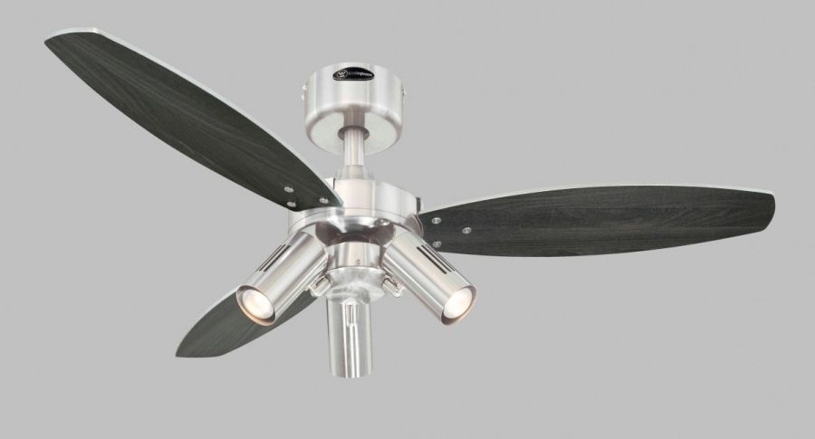 Tzy usztywnione dwustronne łopaty w kolorze wenge i srebrnym, powierzchnie obudowy z wypolerowanego niklu, trzy światła punktowe, każde o górnej mocy 40 watt charakteryzują współczesny wygląd tego markowego modelu od producenta Westinghouse.