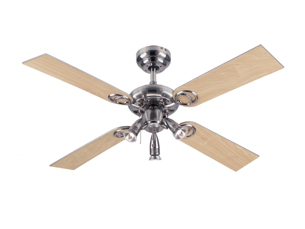 Pearl przykuwa uwagę: cztery dwustronne łopaty w kolorze jasnego klonu i białym, powierzchnie obudowy oraz trzy światła punktowe GU10 wykonane ze stali nierdzewnej kształtują niewątpliwy wygląd tego markowego modelu producenta Westinghouse.